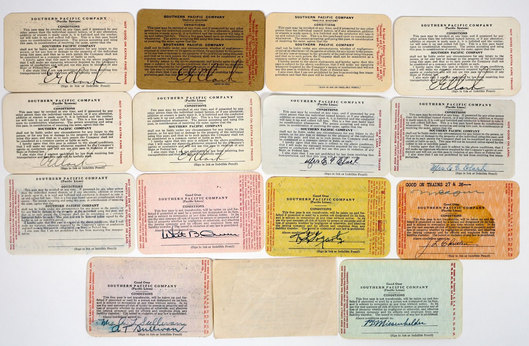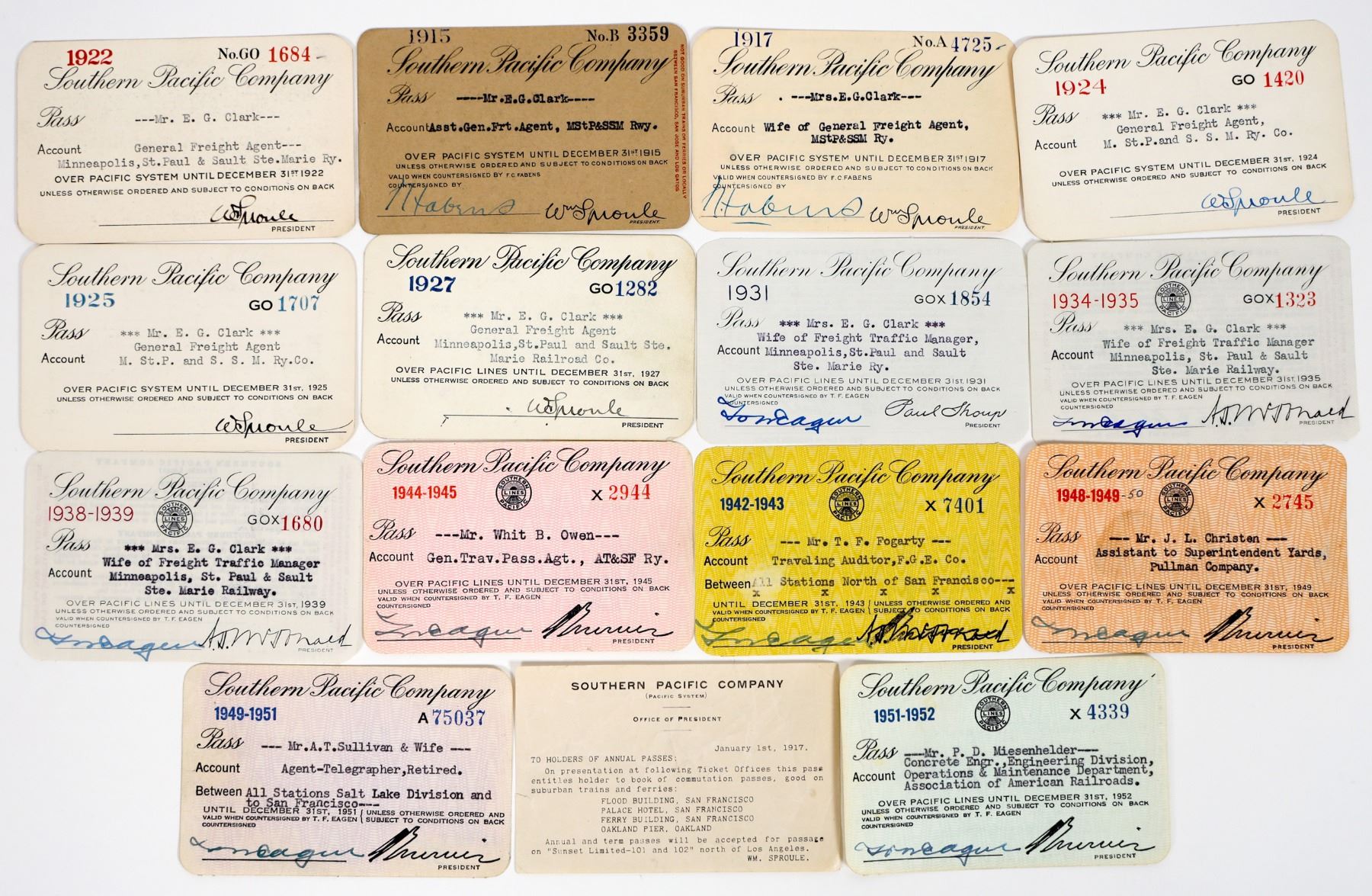 Group of 15 railroad passes from the Southern Pacific Railroad Company. Passes date from the early 1900s; see photos for specific years and additional detail.