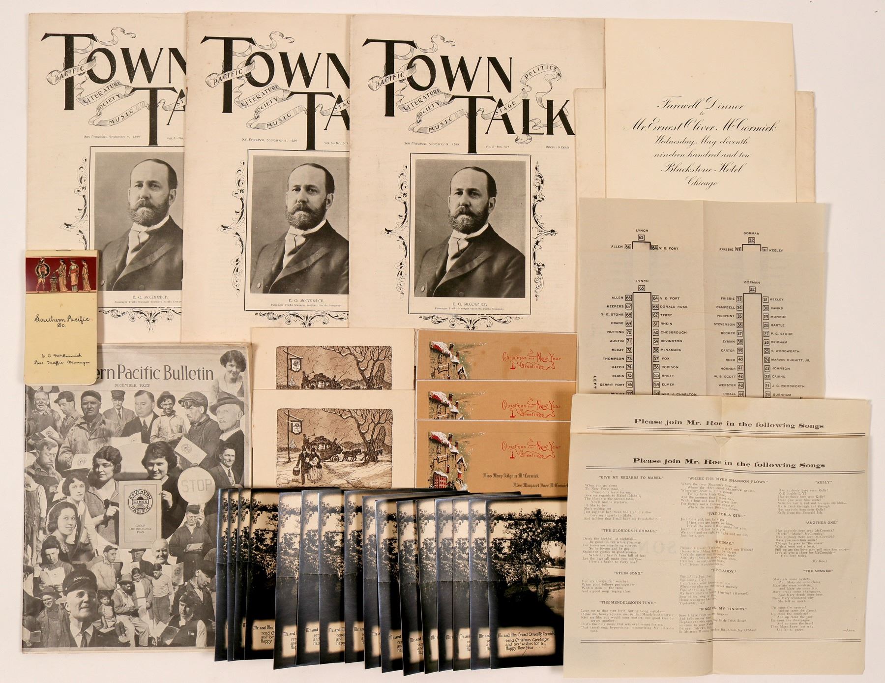 LO McCormick passenger traffic manager of SP related items-1899 San Francisco Town Talk x3, Small fly leaves unused pad, 1923 SP Bulletin, approx 20 Xmas and New Years cards, 1910 farewell dinner invitation