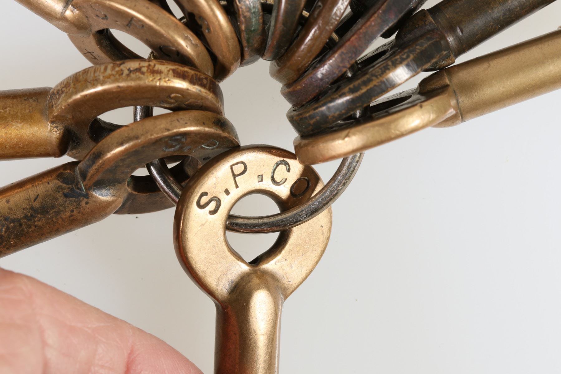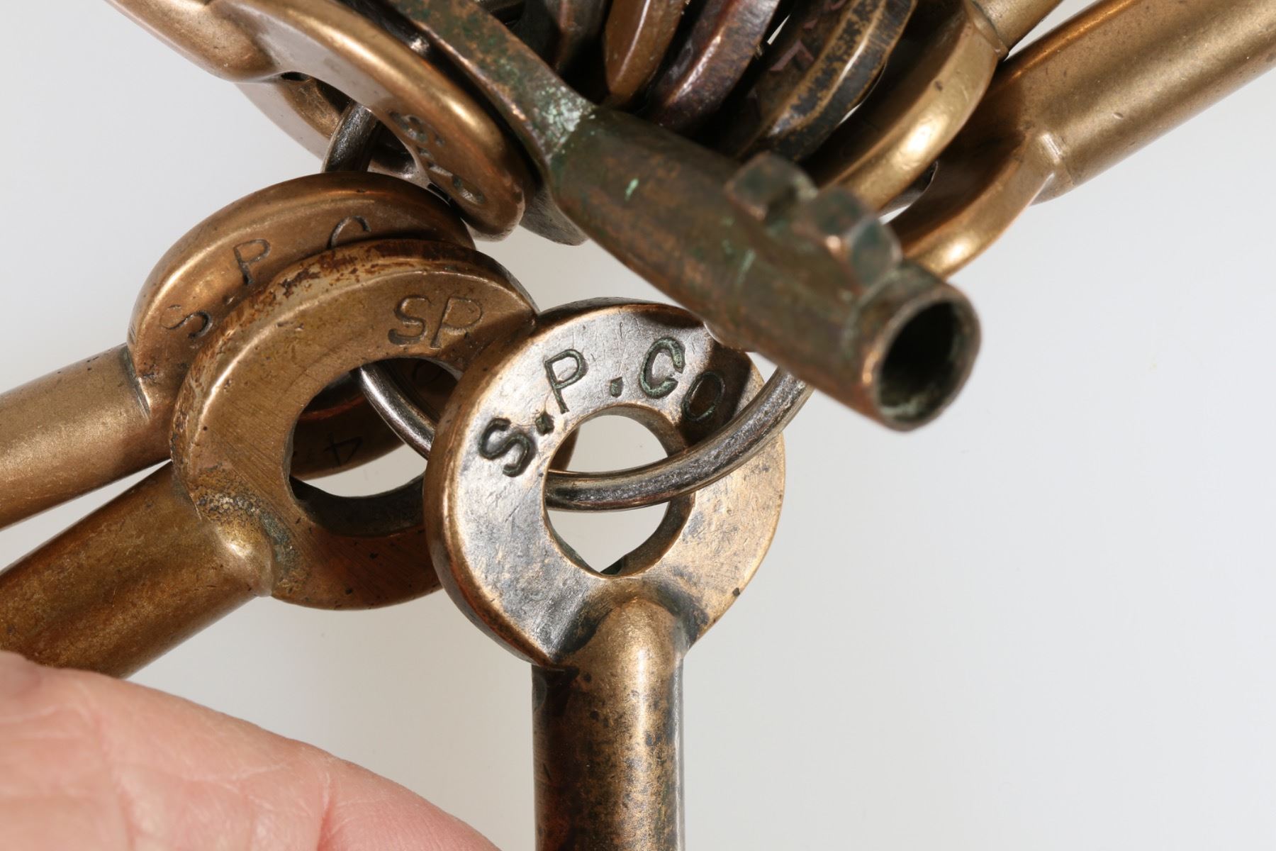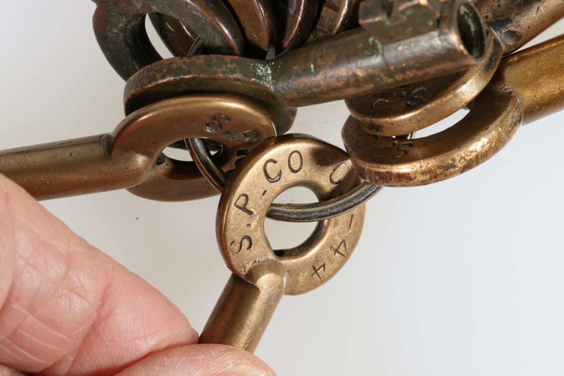 Lot of eleven Southern Pacific Railroad keys. The keys are brass, and each is about 2 inches in length. All are stamped with "S.P. CO" as well as identifying numbers.