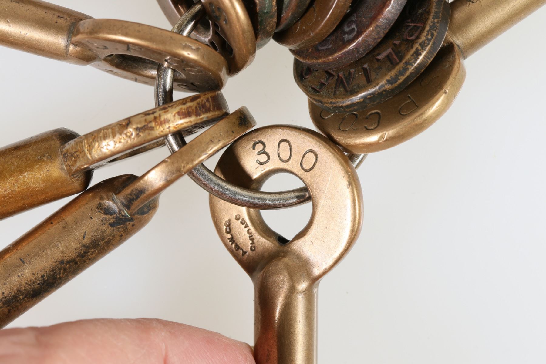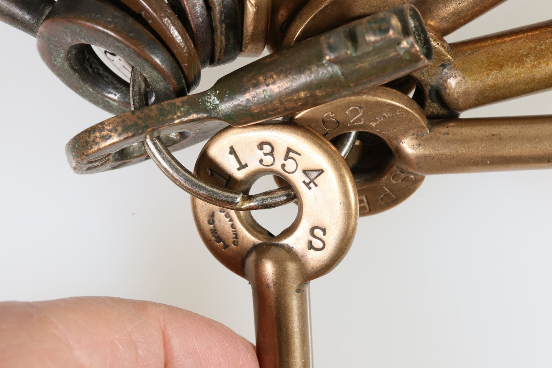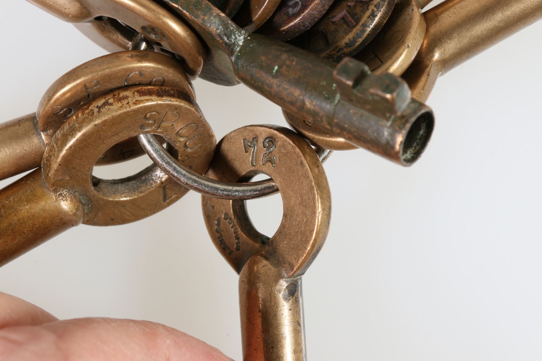 Lot of eleven Southern Pacific Railroad keys. The keys are brass, and each is about 2 inches in length. All are stamped with "S.P. CO" as well as identifying numbers.