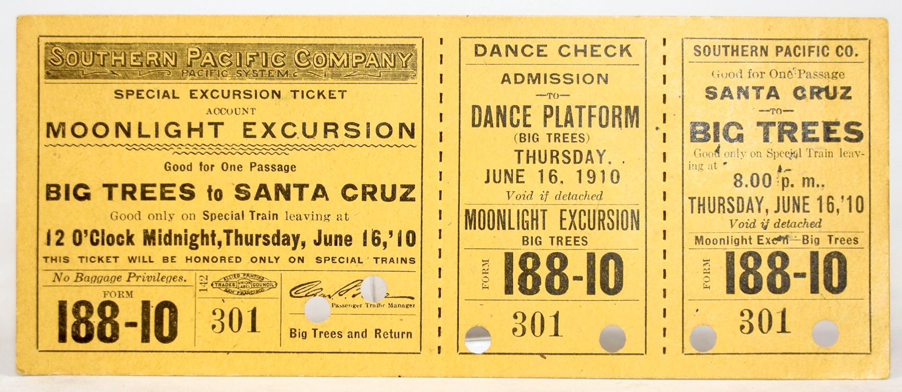 Fantastic! Southern Pacific Company Special Excursion Ticket, Moonlight Excursion, Good for One Passage Santa Cruz to Big Trees, Midnight, Thursday June 16th, 1910. Right side has Dance Check stub for the Dance Platform at Big Trees, which was the massive stump of one of the trees! Punch cancelled. Yellow cardstock. Some adhesive residue on reverse. 2.5 x 6.25" Ex. Ron Lerch