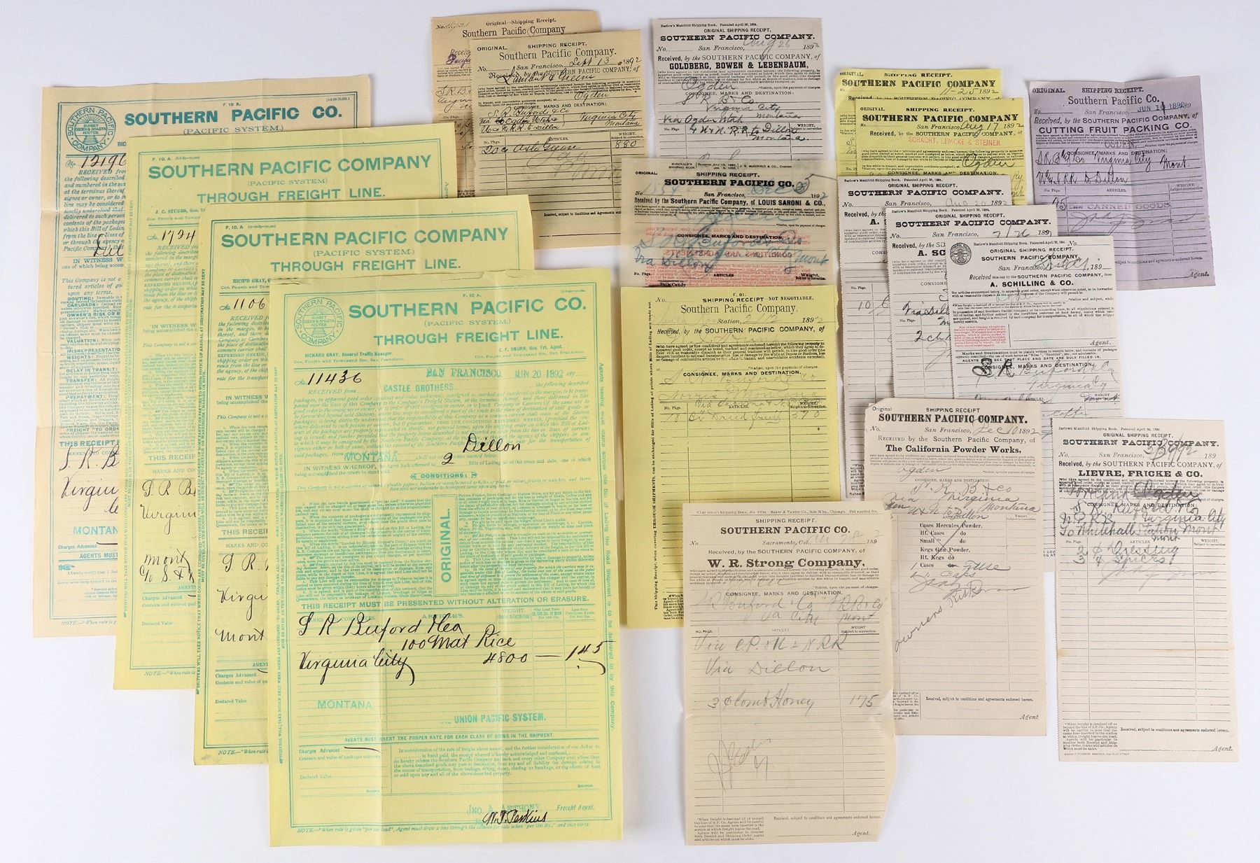 About 18 pieces of Southern Pacific Co. ephemera for loads in and out of Montana c. 1890-93. Receipts for sugar, tea, pickles honey, fruit blasting caps etc. Missouri
