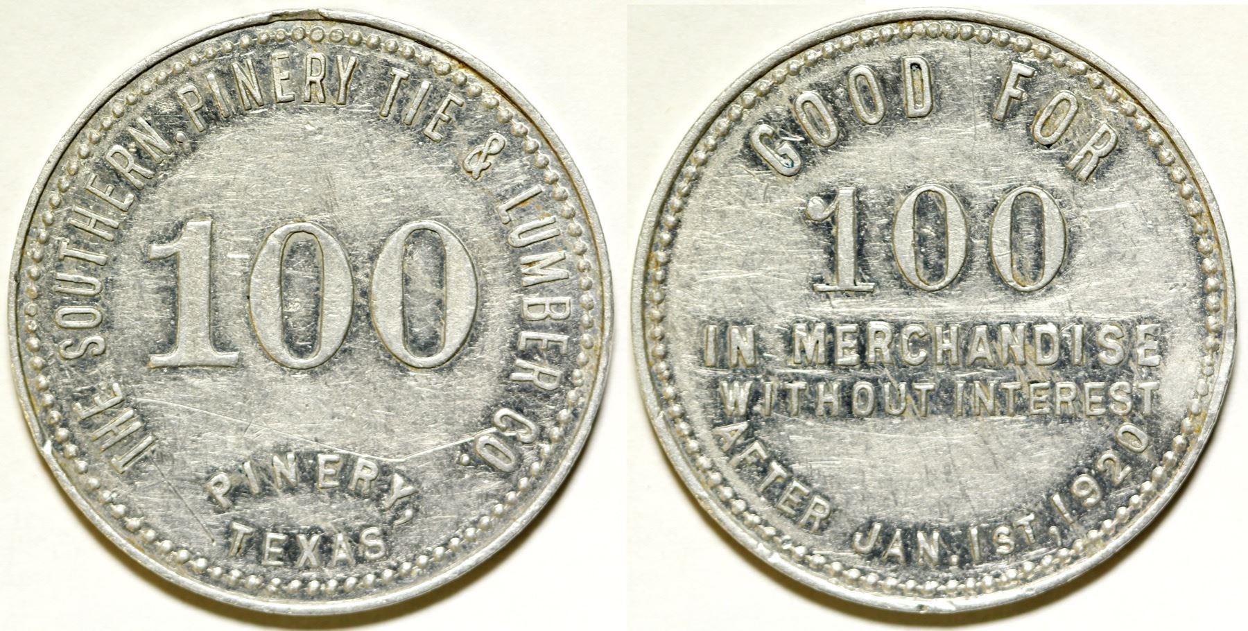 Obv.: The Southern Pinery Tie & Lumber co. / 100 / Pinery, / Texas; Rev.: Good For / 100 / In Merchandise / Without Interest / After Jan. 1st, 1920. Al., rd., 33 mm. State: Texas City: Pinery Date: HWAC# 84041