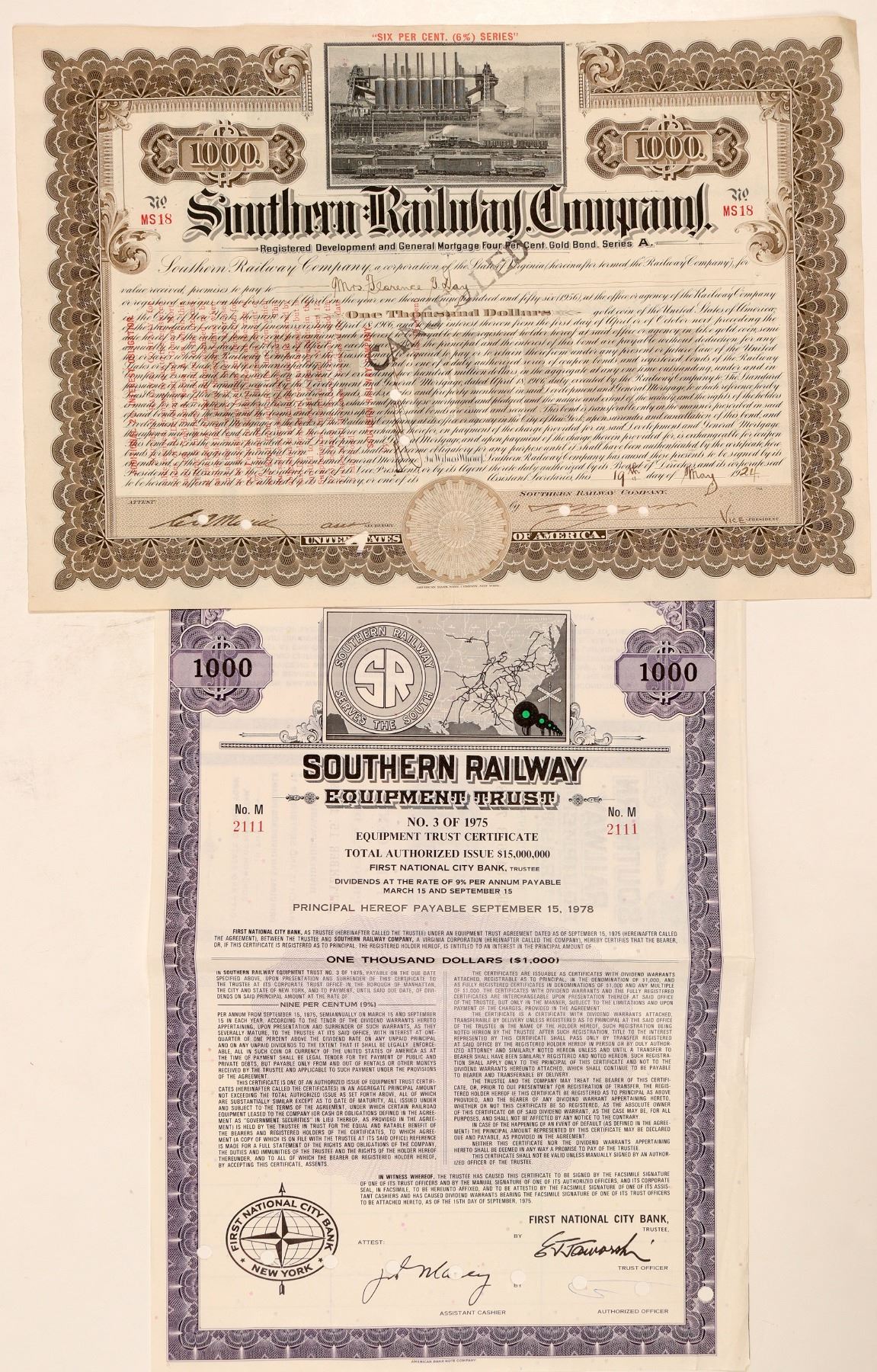 1. #2111, I/C, $1000, 9%, 3 yr, Equipment Trust Certificate (#3 of 1975). ISSUED SEPT 15, 1975. PURPLE, vignette company logo over US map. Six coupons attached. American Bank Note Co. VF