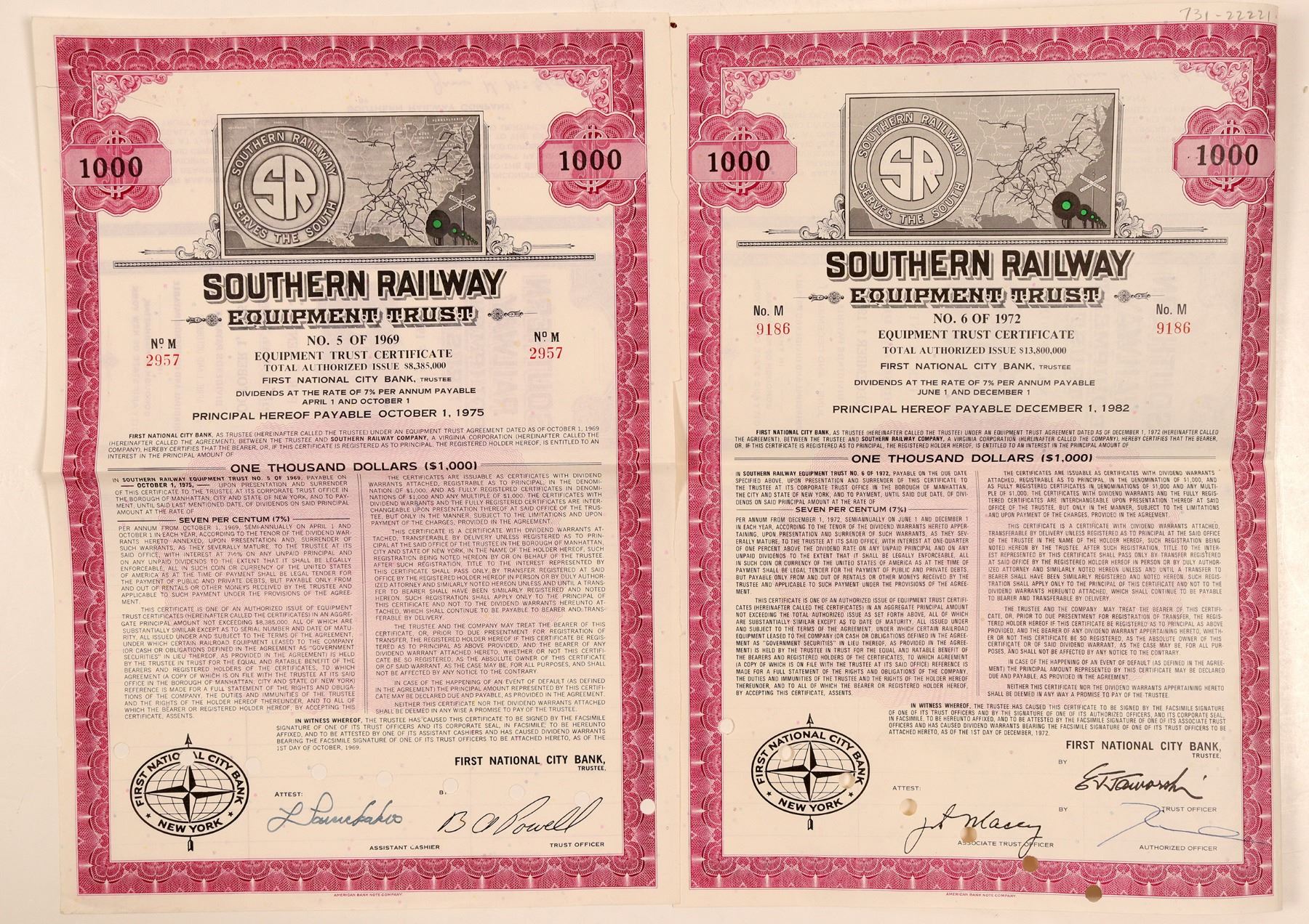 2 certificates. Incorp. June 1894 New York . Both, I/C, $1000, 7 %, , Equipment Trust Certificate, RED, vignette company logo over US map. American Bank Note Co. VF. #M9196 issued Dec. 1, 1972. #6of 1972, Coupons 6-20 attached. #M2957 issued Oct. 1, 1969,#5 of 1969, no coupons. Ken Prag Collection