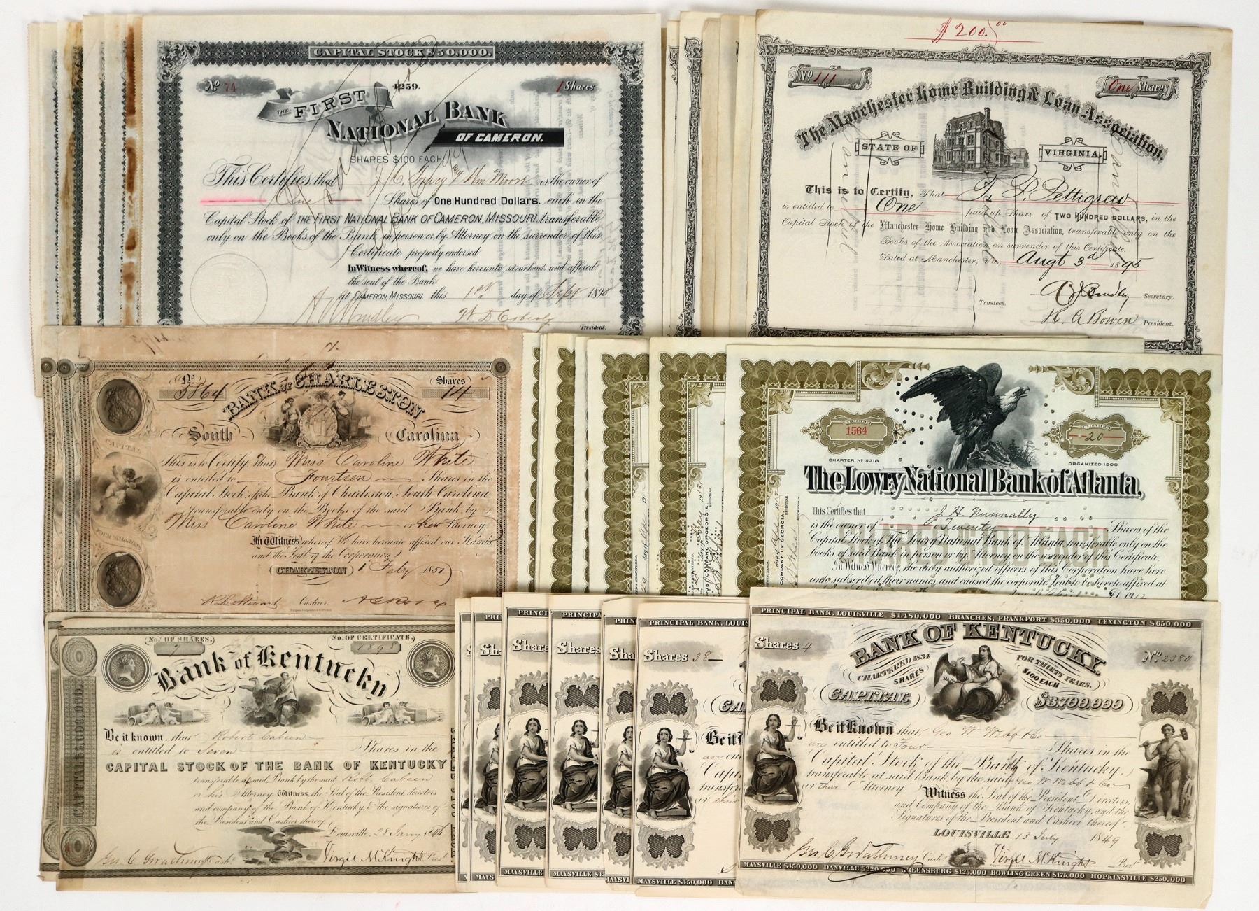 Lot of 43. I/C. Bank of Kentucky, Bank of Charleston, The Lowery National Bank of Atlanta. First National Bank of Cameron, The Manchester Home Building and Loan assoc.. Printers: Frey Stationery, Toppan, Carpenter & Co. .