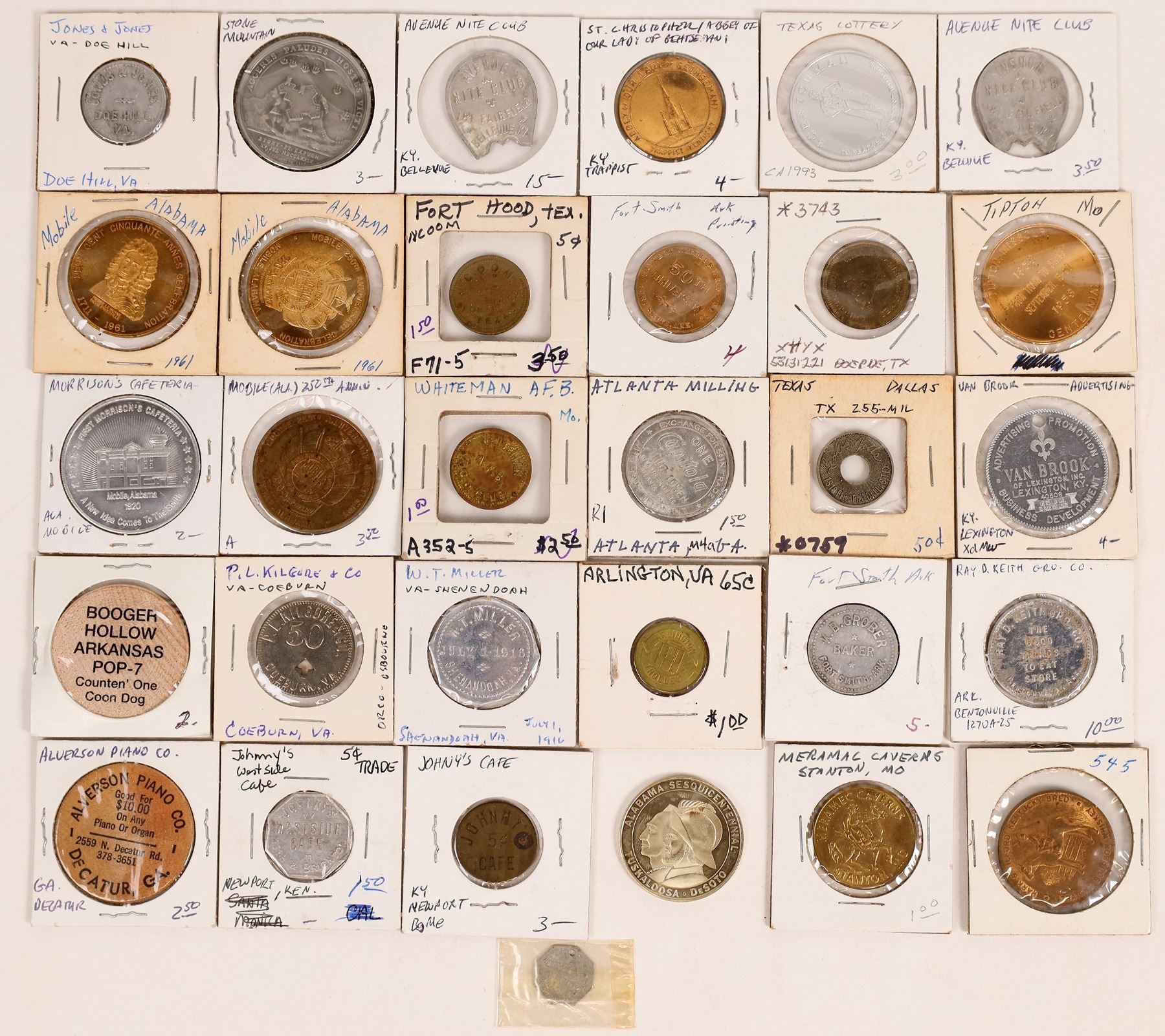 Lot of 30 tokens from Southern states: Alabama (5): 250th Anniversary, (3) Mobile; 1969 Sesquicentennial; Morrison's Cafeteria, Mobile. Arkansas (3): Booger Hollow; Calvert McBride Printing, Fort Smith; K. B. Grober, Fort Smith; Ray D. Keith, Bentonville. Georgia (3): Alverson Piano Co., Decatur; Atlanta Milling, Atlanta; Stone Mountain. Missouri (3): Tipton Missouri Centennial; Meramac Caverns, Stanton; Whiteman A. F. B. Johnson County. Virginia (4): Arlington Trolley; P. L. Kilgore, Coeburn; Jones & Jones, Doe Hill; W. T. Miller, Shenandoah. Texas (4): Fort Hood; Mills, Dallas; Williams Campground, Boerne; Texas Lottery. Kentucky (8): Our Lady of Gethsemani, Trappist; Johnny's Cafe, (2) Newport; Avenue Night Club, (2) Bellevue; Hartsfeld Reduction, Newport; Van Brook, Lexington; Park & Tilford Kentucky Bred Bourbon Whiskey, Louisville.