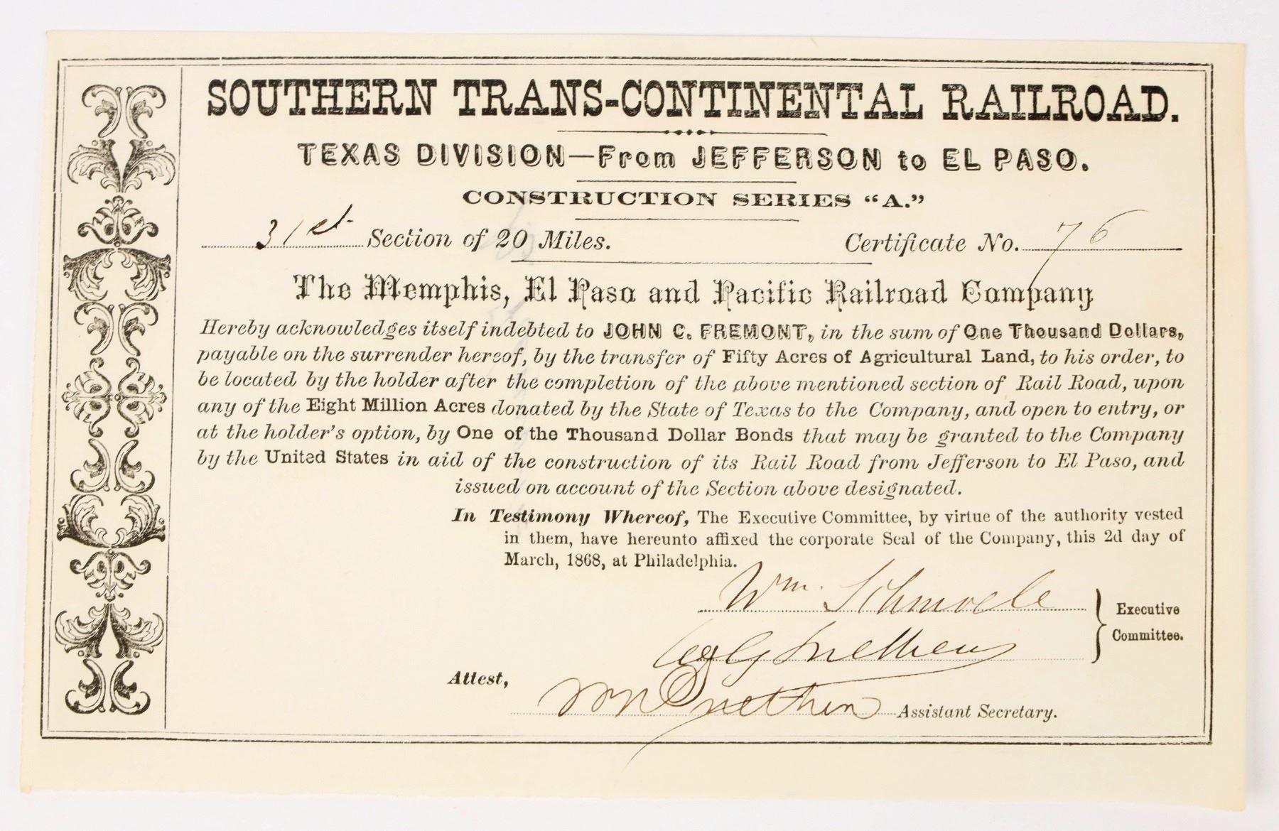 Texas Division--From Jefferson to El Paso. Construction Series A. Memphis, El Paso & Pacific Railroad Company. Text mentions that company is indebted to John C. Fremont for $1,000 for 50 acres of Agricultural Land. March 1868. Three corporate signatures. Fremont signs the reverse. 4.75 x 7.75" John C. Fremont was an American explorer, military officer, and politician whose expeditions in the 1840s helped map the American West and earn him the nickname "The Pathfinder." He played a key role in the U.S. conquest of California during the Mexican-American War and later became one of the first two U.S. Senators from the new state. In 1856, Fremont was the first presidential candidate of the newly formed Republican Party, running on a platform opposing the expansion of slavery. The Southern Trans-Continental Railroad refers to the southernmost route of America's transcontinental rail lines, ultimately linking the Gulf of Mexico and the Southwest to California. Championed in the 1850s by Southern politicians‚-especially Jefferson Davis‚-it aimed to secure a warm-weather, low-elevation path across the continent. After the Civil War, the dream was realized through lines such as the Southern Pacific, which completed a continuous southern route to the Pacific in the 1880s.