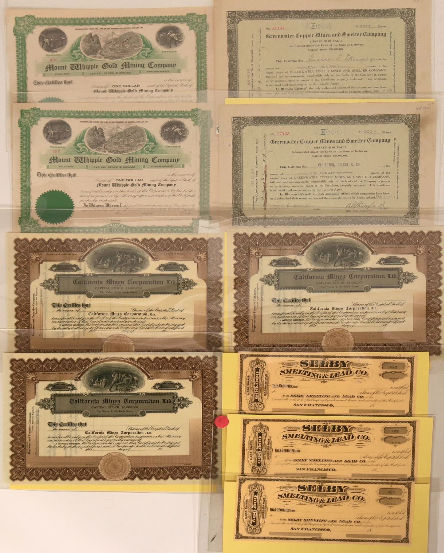 Ten stock certs from various mining operations. All but two from Greenwater Copper Mines& Smelter Company, are unused. Other companies include California Mines Corporation, Shelby Smelting & Lead Co. and more.