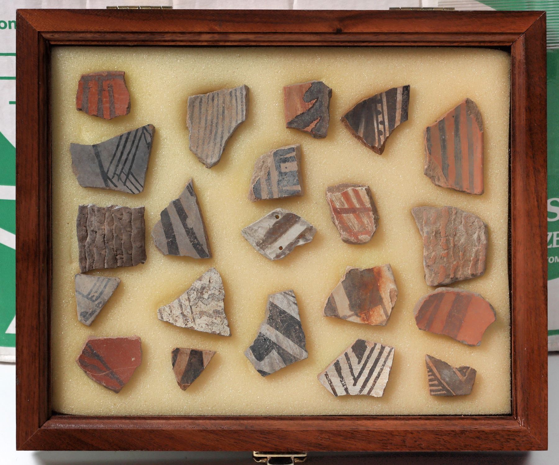 This group of pottery shards are from the southwest, as no known specific locations are known; 21 pieces in all. Examples include several pieces of Ancestral Puebloan culture polychrome and black, white and black, and gray and black. Several pieces are made using the coiled rope method where the outside surface is still rough indicating an early pottery made for utilitarian purposes. Several pieces are decorated on the inside only, while others are decorated on both sides inside and out. There are several colors of clay indicating several locations for clay sources, as well as different painting designs. This lot spans a considerable time-line for pottery making methods. This single walnut display case is a treasure for examination of human existence in the Southwest United States. From the Gary Bracken collection. 10 in. X 12 in. Please see photo for details.