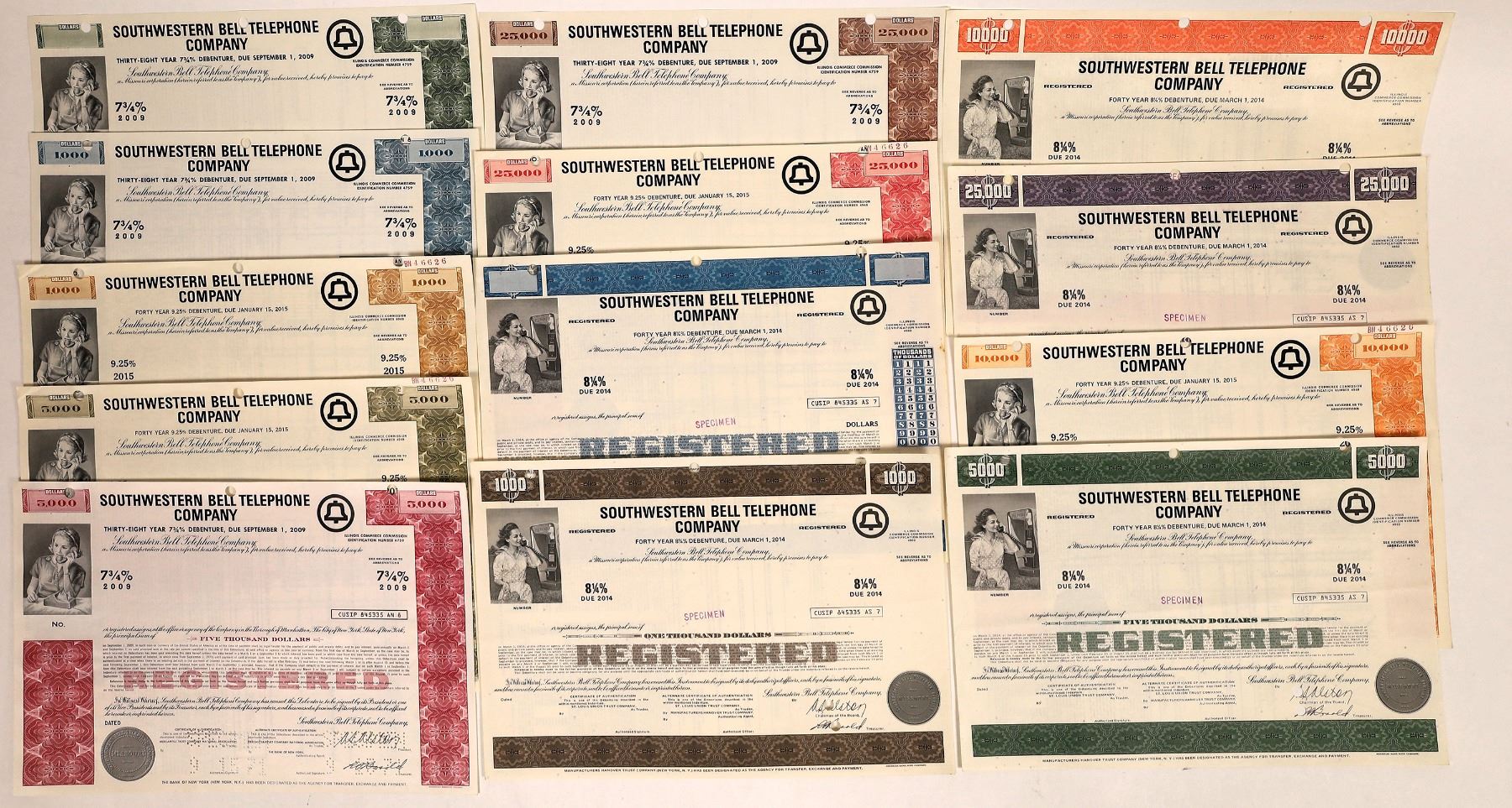 Lot of 13 different including five Specimen bonds. $1,000, $5,000, $10,000, $25,000 denominations. Eight have a vignette of a younger girl talking on the phone. The other 5 show a woman talking on a pay phone. Federated Banknote Co. and ABN.