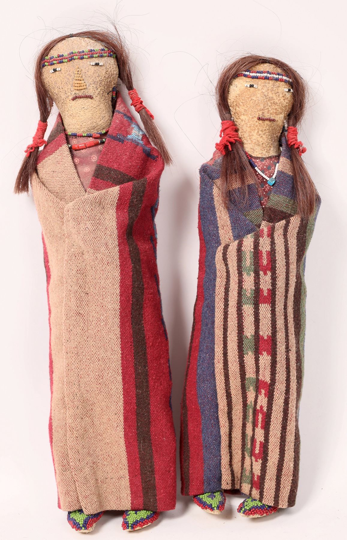 Lot of 2. Native American dolls of the Southwest area possibly Zuni or Navajo. Each handmade doll is 14" tall and has small bead work that make up the mouth, eyes, necklaces and ear beads. Hair is tied into pony tails. Both are wrapped in blankets, have moccasins with bead work. Have no damage that is visible, overall condition excellent. Date possibly early 1900's.