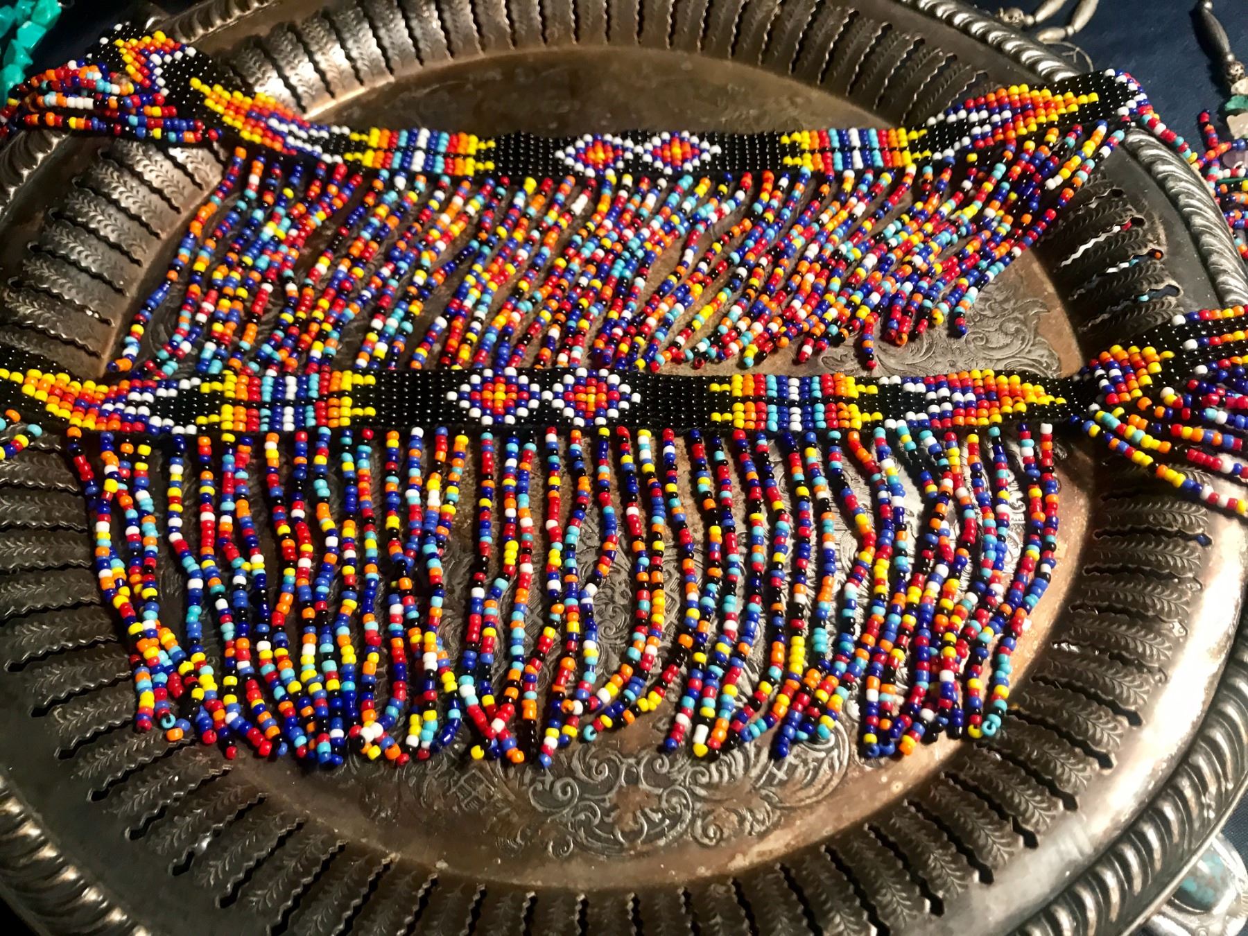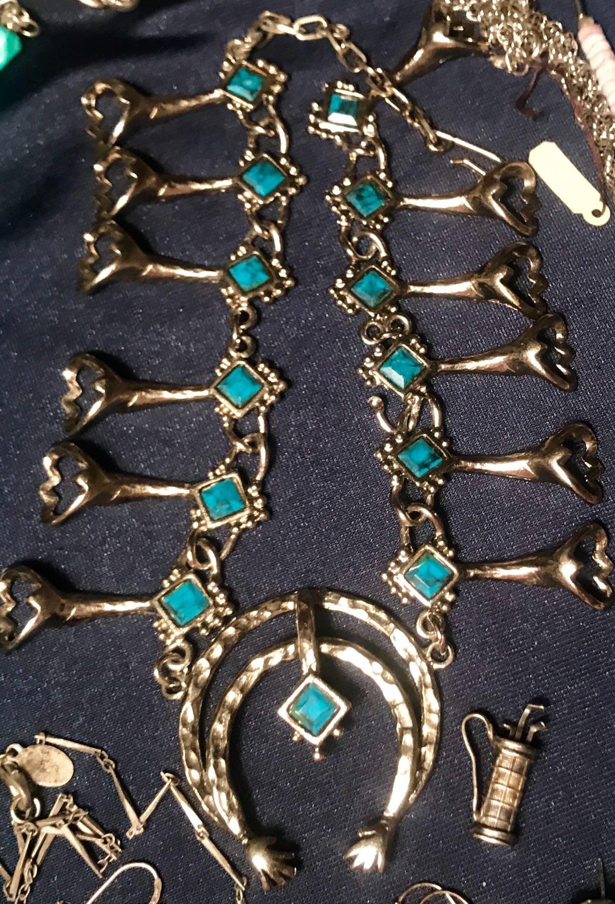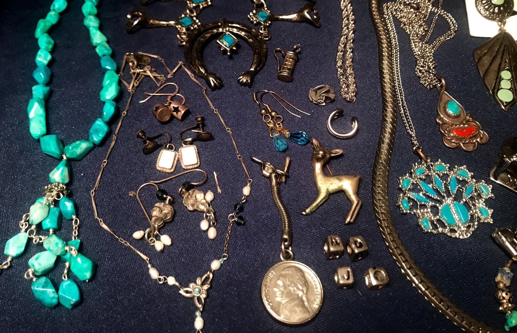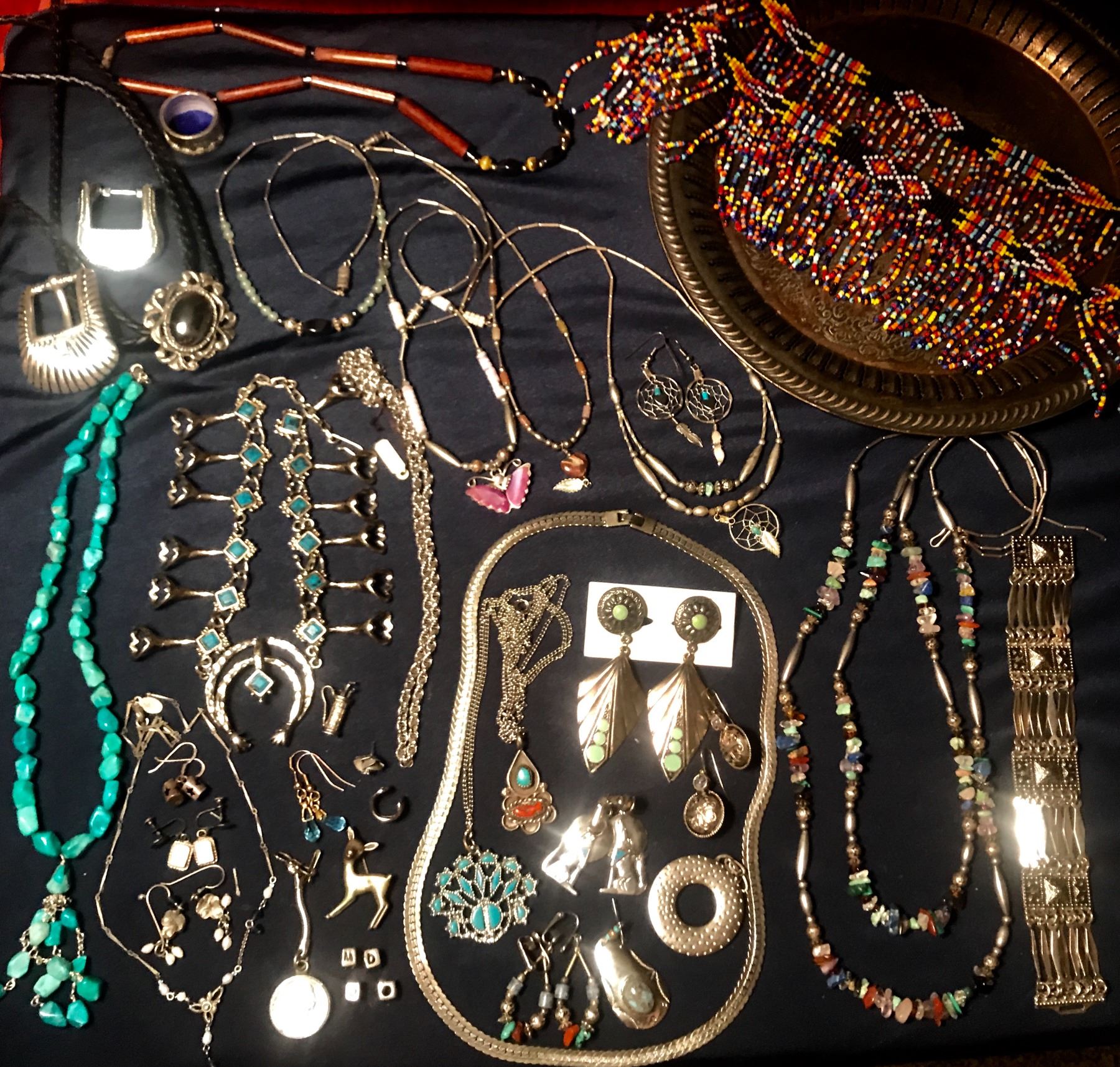 Large resale lot perfect for retail/dealers. 2-3 pieces are sterling, the rest are plate or silver-colored. Very long double strand necklace with silver beads and natural multi colored stones is sterling with genuine stone, artisan made, but one strand needs to be retied to clasp. Sterling silver pendant with genuine turquoise and coral. American Indian beaded headband, broken threading in one place needs to be re-tied. Silver plated serving tray made by Empire Silver Co. Trademark of Benedict Mfg. Co. Other genuine stones, hematite, pooka shells, genuine pearls on designer necklace/earrings at bottom left made by Cara Stimmel Ltd. Nice variety of attractive pieces perfect for resale in southwestern shop or event.
