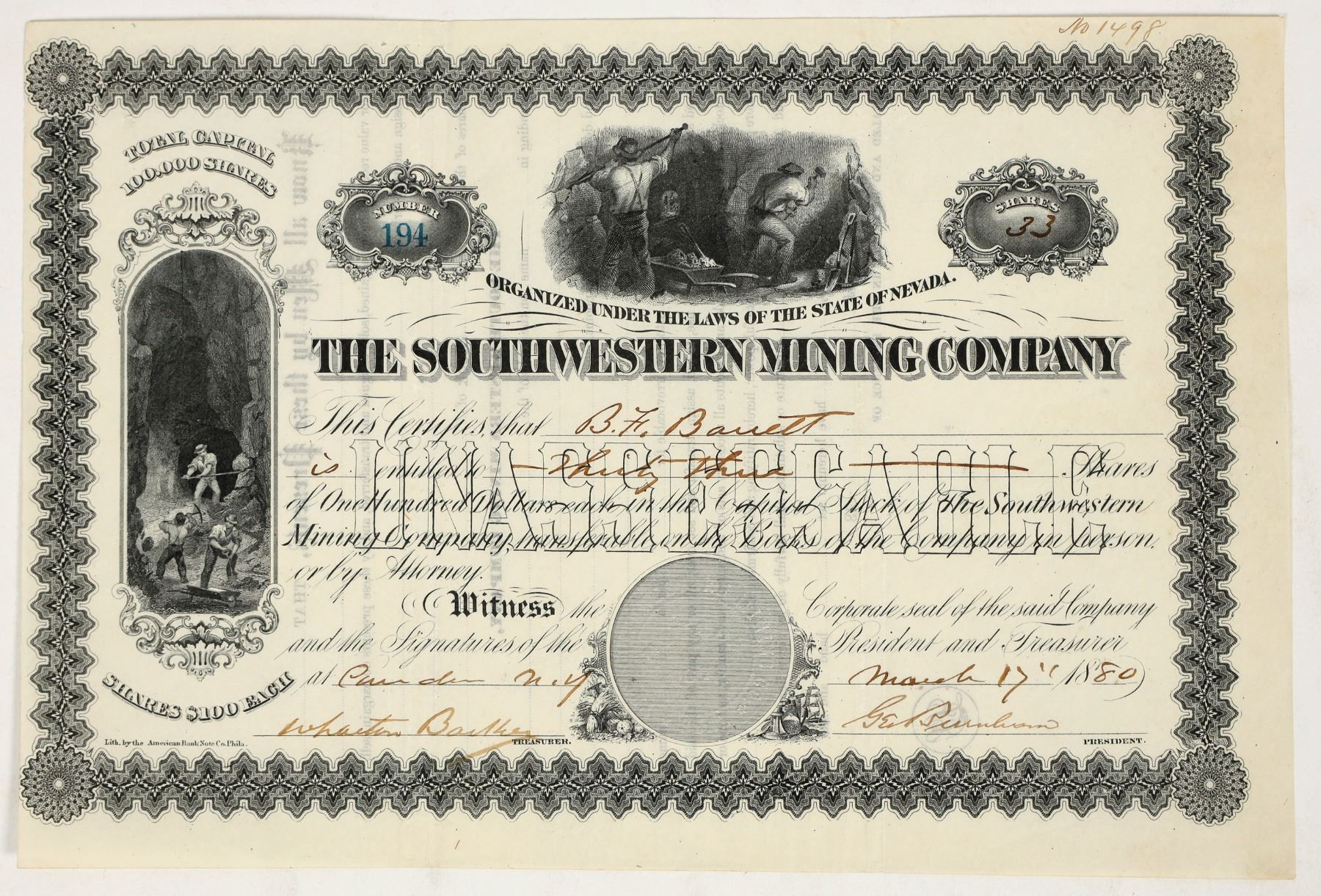 The Southwestern mine was located in Eldorado Canyon east of Nelson, Clark County (we sold a letterhead from them with dateline El Dorado Canyon). WS Mills was the superintendent. Organized under the laws of Nevada. No. 194, issued for 33 shares to BF Barrett in NY in 1880. Signed by president Burnham and the treasurer. Not cancelled. Two different mining vignettes, silver seal. ABN. 7 x 10.25" Pinholes, folds.