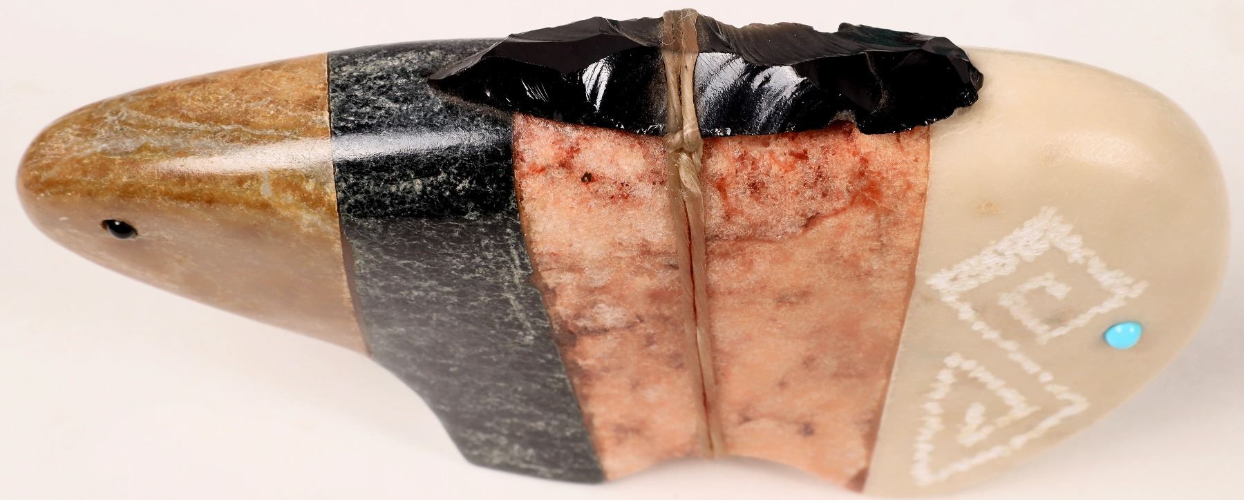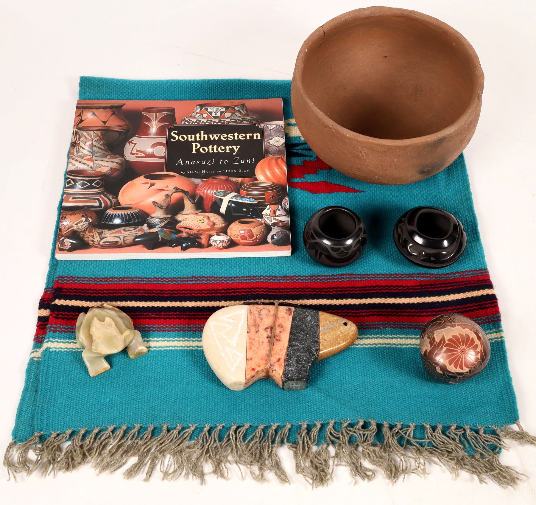 Southwestern Pottery by Hayes and Blom. Turquoise Mexican mat 19x39". Frog fetish 3.25x2.5". Oversize stone animal fetish 4x6.5". Small brown covered top pot, signed Eric Tafoya SCP, 2.75x2.75". Black Santa Clara pot signed Johanna 2x3.25". Black pot signed Marvin & Frances Martines 2x3". c. 1900 brown pot, 4x8.5", 3.5" side crack. Nice assortment to start or expand a collection.