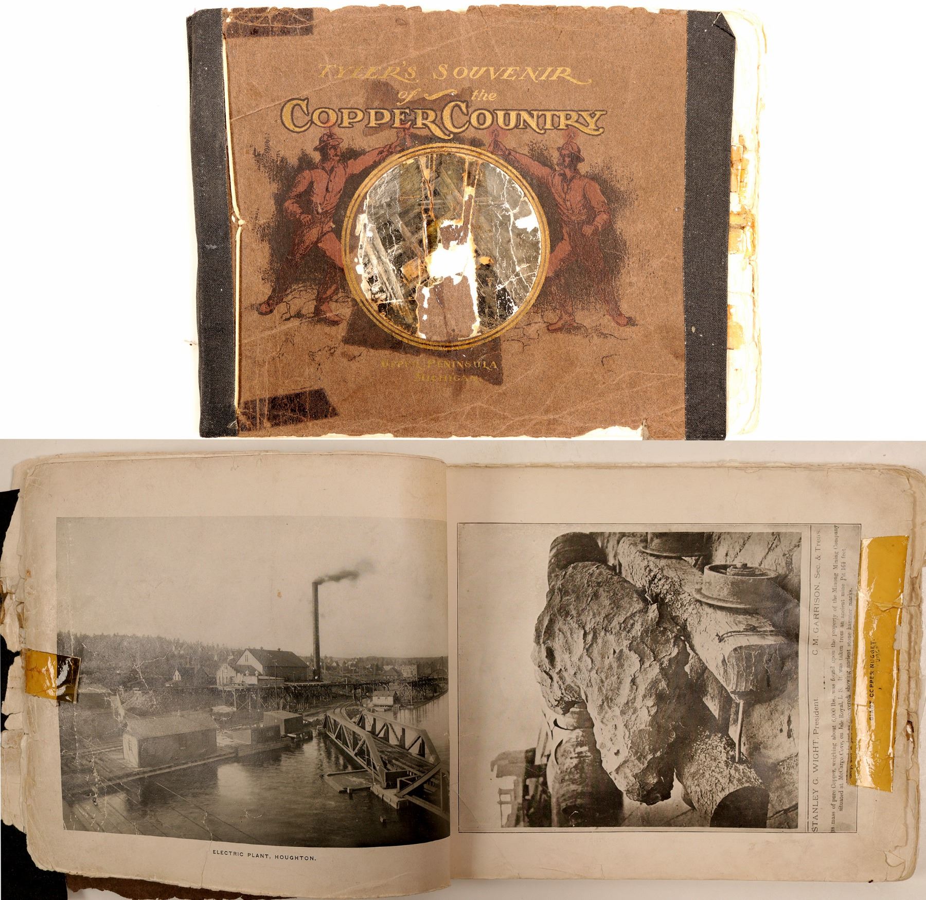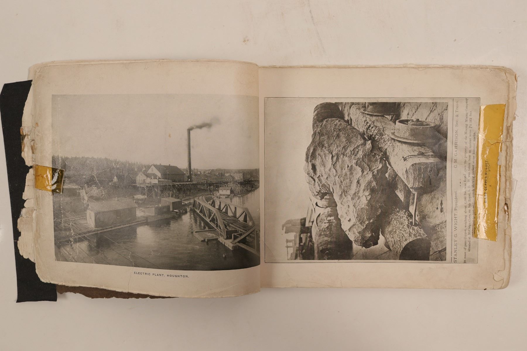 Here is another great publication, of the " Copper Country " ( Michigan ). This is the second addition, which includes several of the old time photographs. There are a lot of good pictures but, my favorite is of the 6,000 pound copper nugget found , with ancient tool marks on it!! ( No, I am not Kidding!). 7" high x 9" long. Published for O.F. Tyler, by The James Bayne Company, Grand Rapids, Michigan. Page ends well worn, and tattered. But, the photos inside are great. Very RARE booklet. Can you dig it ? ( RH).Houghton Estate Collection