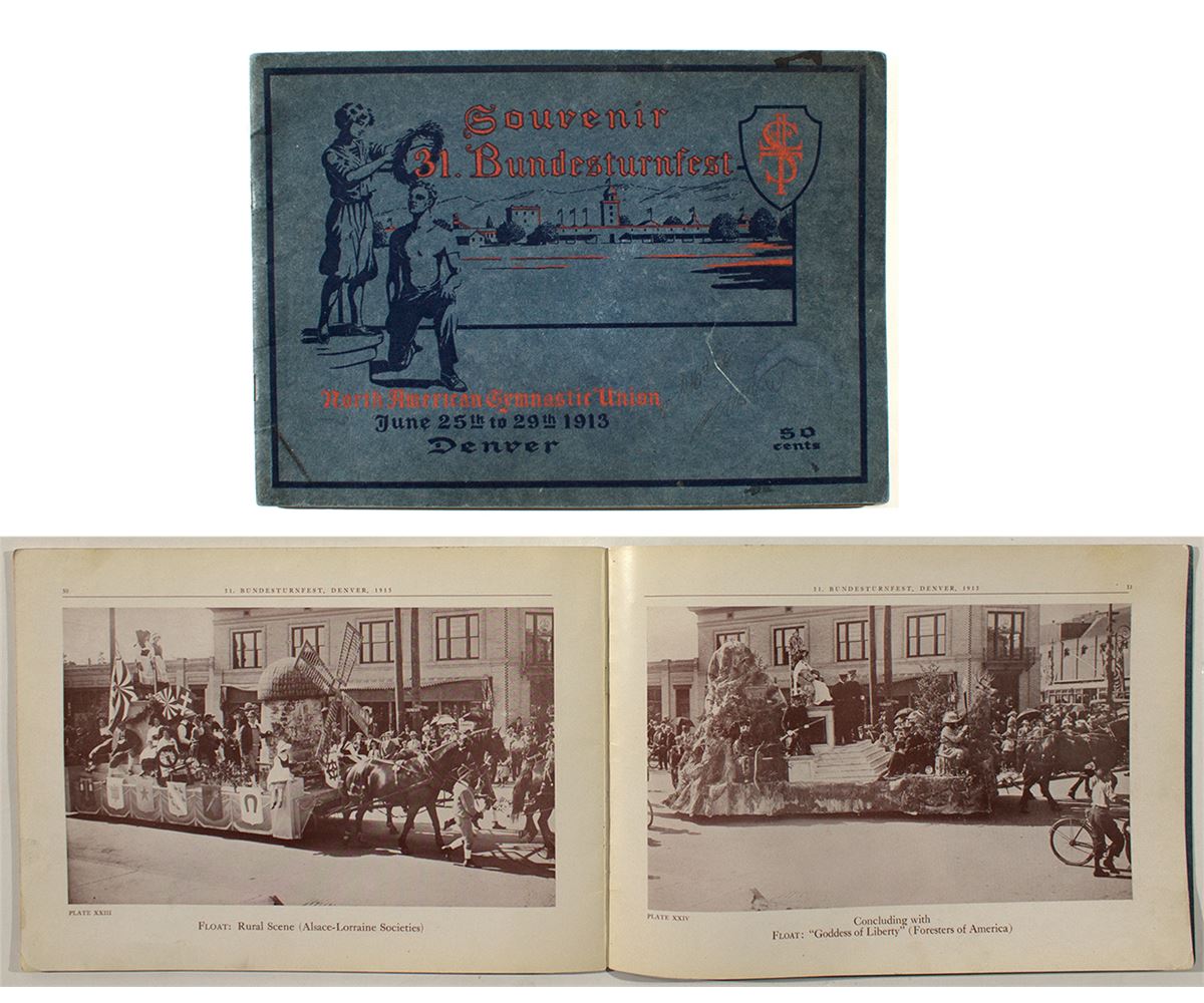 North American Gymnastic Union. A photographic souvenir of the Historical Parade June 26, 1913 during the 31. Bundesturnfest held at Denver, Colorado. Blue soft cover, dark blue and orange type and illustration. (7.75" x 10.75") 32 pp.