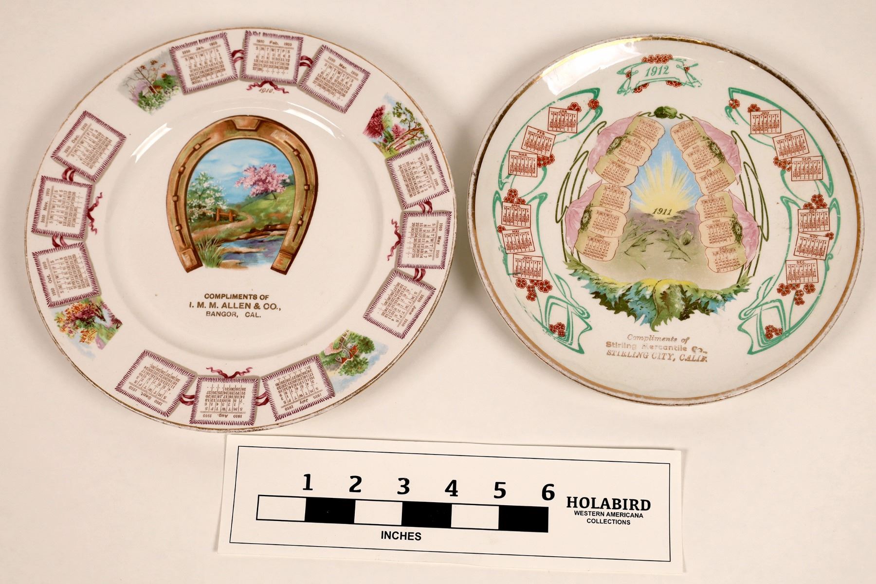 Lot of 2. 1) 1912, Compliments of Stirling Mercantile Co. Stirling City, Calif. Reverse: blank. Diameter: about 8.5 in. 2) Compliments of I. M. M. Allen & Co. Bangor, Cal. Reverse: blue, K.T. & K. Co. Ramona. Semi-Vitreous Porcelain. Diameter: 9.25 in. California Oroville Fred Holabird Collection