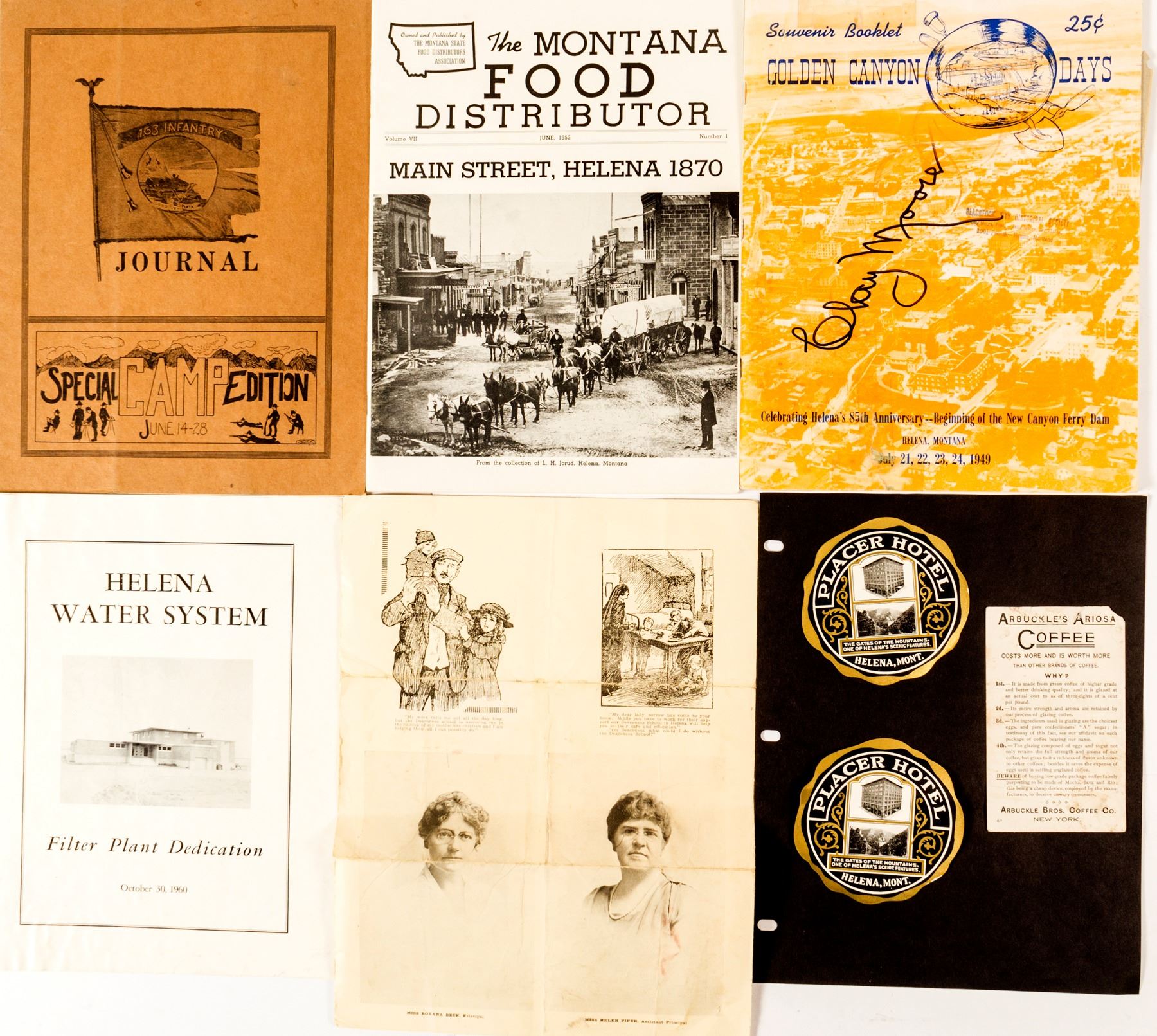 Placer Hotel and Arbuckle's advertising items. Montana Deaconess School at Helena showing students and grounds.163 Infantry Journal. Helena Water System, Filter Plant Dedication, October 30, 1960 brochure. The Montana Food Distributor, June 1952. Golden Canyon Days, Souvenir Booklet, July 1949. Souvenir booklet, Golden Canyon Days, July 1949.