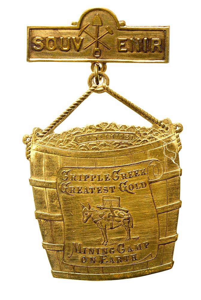Souvenir Cripple Creek Greatest Gold Mining Camp on Earth, ore bucket-shaped gold masonic badge. City: Cripple Creek State: Colorado Date: hwac# 35752
