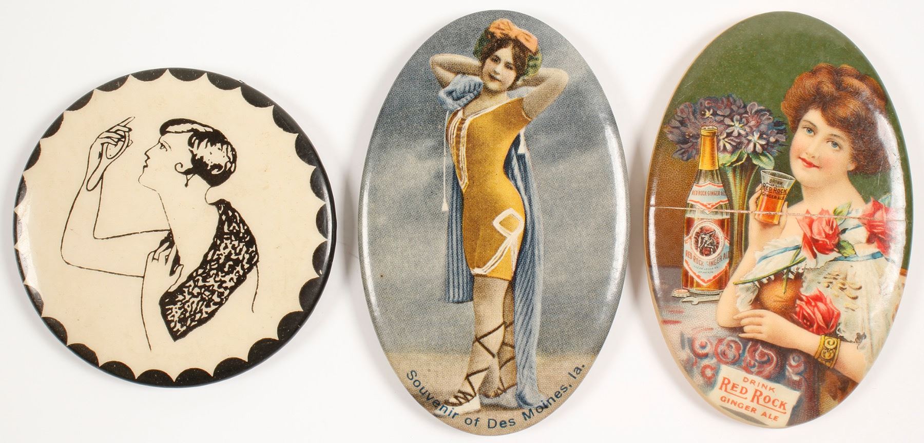 Lot of three: 1) Souvenir of Des Moines,Ia. oval, 3 inches tall. 2) "Drink Red Rock Ginger Ale," oval, 3 inches tall. 3) Lady admiring herself in a mirror, round, 2 inches in diameter. HWAC# 61612 Date: Location: