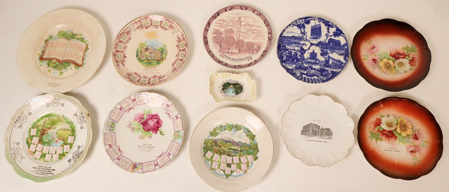 Lot of eleven. 1.) 1910 Calendar Plate 10" Compliments of Mrs. John Roth, Anita, PA. Reverse stamp K.T.A.K. 88 Ramona (sp?) somewhat illegible 2.) Floral Plate 8" Reverse stamp compliments of William Falkenstein, Anaheim, Cal. 3.) 1910 Calendar Plate Compliments of West Side Department Store, Providence R.I. 9.25" small chip on outer edge reverse stamp E. E. C. co Porcelain 4.) Souvenir of Saco, ME. 8" reverse stamp china 5.) 1909 Calendar Plate 8.25" Compliments of Dominik Lekovirz Courtney PA. Reverse stamp W.E. China 6.) 1910 Calendar plate Henry Riegler Grocer, Weehawken Heights, N.J. 8.25" reverse stamped Dresden China 7.) 1909 Calendar Plate London Importers Boston, reverse Cartwright Bros. 8.25" diameter, visible crack. 8.) Mass Institute of Technology Boston 7.25" reverse stamp Carlsbad BFHS China Made in Austria 9.) Pilgrim Memorial Monument Provincetown Mass. 7.5" Reverse stamped Old English Staffordshire Ware England 10.) Souvenir of New London Mass, 7.5" reverse stamp Jonroth England 11.) 3x5" Dish, Morris Canal at Rockway, N.J. reverse stamp Millar China