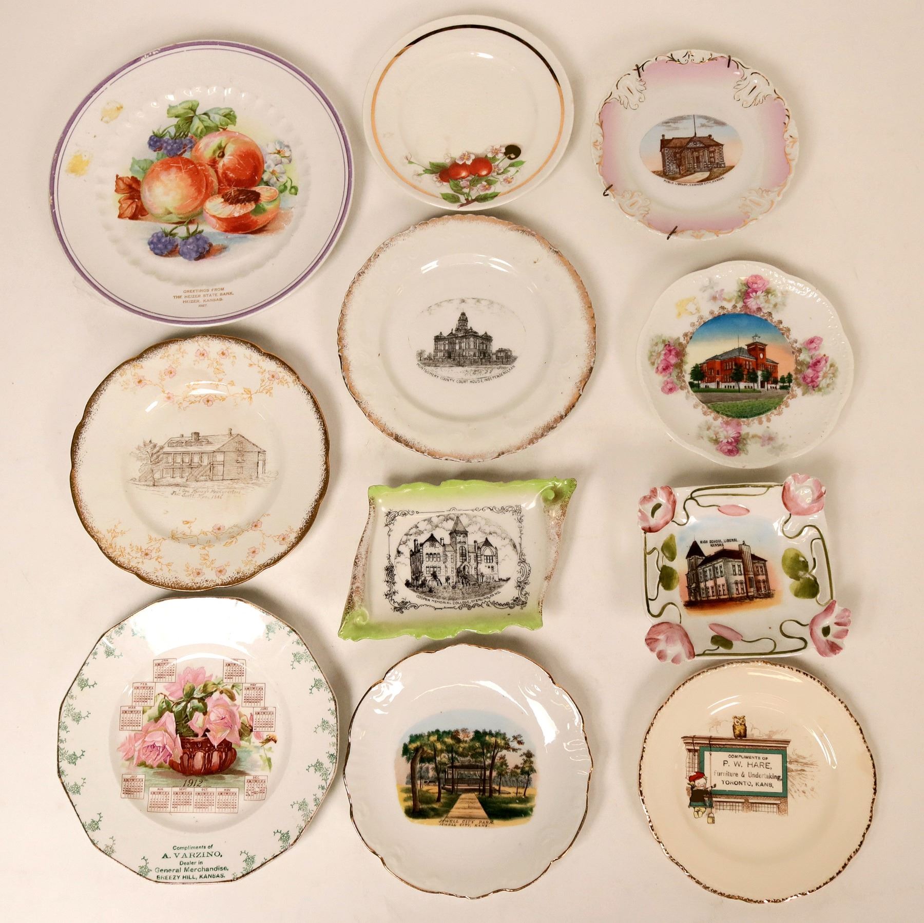Lot of eleven items. 1) High School Liberal Kansas dish 4.5 x 5-inch no reverse stamp; 2) 5.5 x 4.75-inch dish, Cooper Memorial College, Sterling, Kans. Wheelock, Vienna made for A.L. Minger Sterling Kans. Austria; 3) Public Library, Gawker City, Kansas 6-inch made in Germany J.G. McClun Oawker City Kansas; 4) P.W. Hare, Furniture & Undertaking, Toronto, Kans. 6-inch reverse stamp Harker 1840; 5) Floral 6.25-inch Reverse; Made especially for H.E. Madden & Co., General Merchandise Studley, Kansas; Where you get more for cash; 6) Jewell City Park. Jewell City, Kans. 6.5-inch reverse: Wheelock Germany made for J.D. Robertson Mer Co. Jewell City Kansas; 7) Gen Karney's Headquarters Fort Scott, Kansas, 1846. 7.25-inch Reverse Chelsea China J.P. Robens Fort Scott Kansas; 8) 1912 Calendar Plate A. Varzino, Dealer in General Merchandise, Breezy Hill, Kansas. 7.5-inch Puritan China; 9) High School Yates Center Kans. 6-inch reverse stamp Wheelock Vienna made for R.H. White Yates Center, Kansas; 10) Montgomery County Court House, Independence, Kansas; 7.25-inch reverse; Wheelock China Made in Austria for Overhiser & Anderson Independence, Kansas; 11) Heizer State Bank. Heizer, Kansas 1927. 9-inch reverse; Chinaware Columbia.