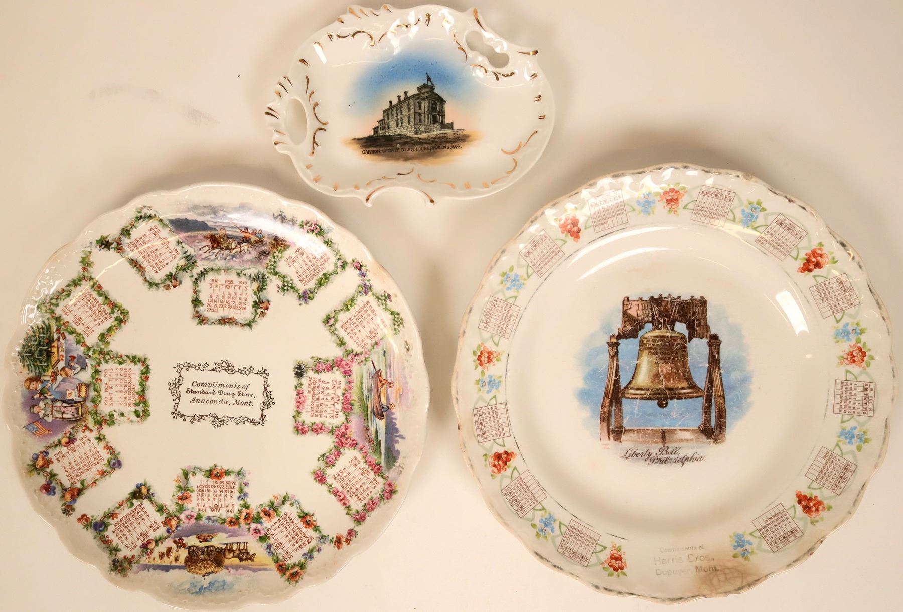 Lot of three. 1.) 4x6" dish. Carbon County Court House, Rawlins, Wyo. Reverse stamp Wheelock China Austria, Made in Austria for N.R. Eastman Rawlins, Wyo. Vienna. 2.) 1914 Calendar Plate 9" Liberty Bell Philadelphia, Compliments of Harris Bros. Dupuyer, Mont. Reverse stamp Carnation McNicol 3.) 1910 Calendar Plate 9" Compliments of Standard Drug Store, Anaconda, Mont. Reverse stamp Homer Laughlin Hudson