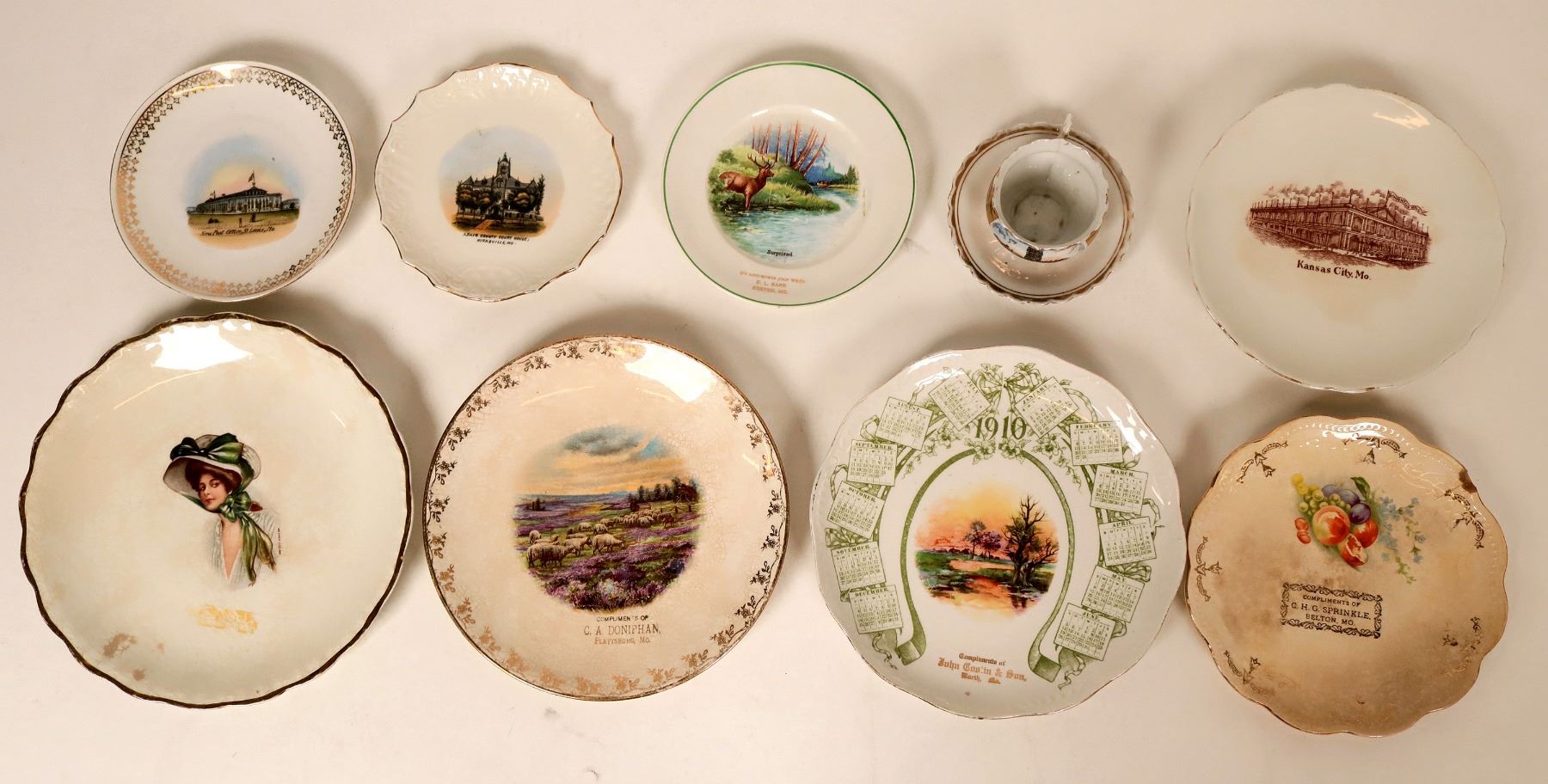 Lot of 10 pieces. 1/2.) Teacup & saucer 1 Court House Street, St Louis Mo., stamp on bottom of cup is illegible. 3.) Adair County Court House, Kirksville, Mo. 6" Made in Germany for C.A. Robinson & Co. Kirksville, Mo. 4.) R.L. Barr, Exeter, Mo. 6" Semi porcelain 5.) New Post Office, St. Louis, Mo. no reverse stamp. 6.) C.H.G. Sprinkle, Belton, Mo. 7.5" reverse stamp is illegible 7.) Lady with green bow on her hat, Perm Cprt A. Gunn 1908. 9.25" Reverse stamp Sterling Furniture and Carpet Co., Springfield, O. Carnation, McNicol. 8.) C.A. Doniphan, Plattsburg, Mo. W.S. 8.5" Reverse stamp George White Granite 9.) Convention Hall Kansas City, Mo. 7.5" Made by the American China Co. Toronto, Ohio. 10.) 1910 Calendar plate John Coslin & Son North, Mo. 8.5" Reverse stamp N.C. Co. E.L.O