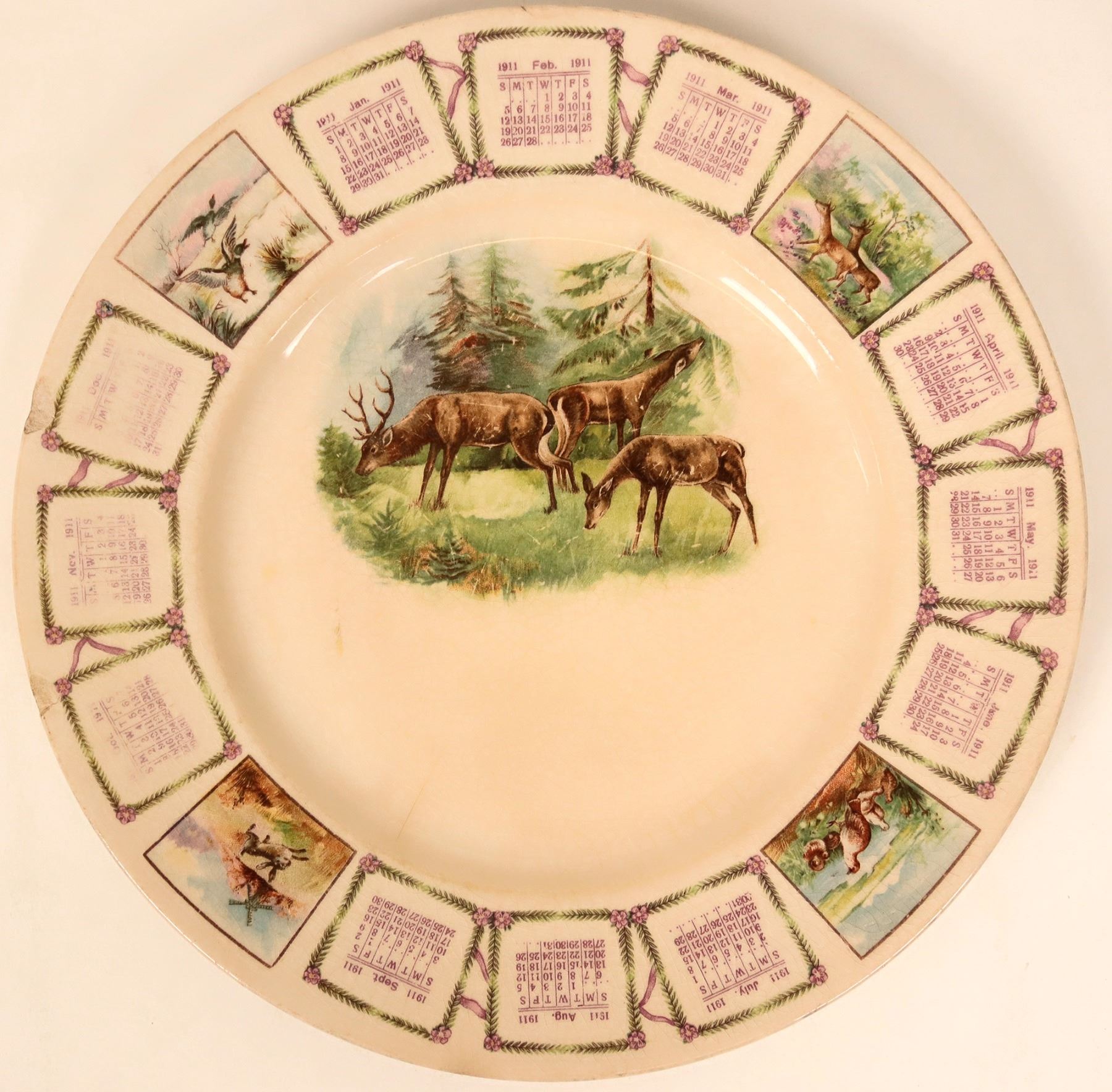 1911 Calendar plate with deer scene. Approx. 9.5" Reverse stamp Semi-vitreous Porcelain K. T. & K Co. 308