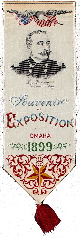 Very attractive ribbon with red tassel. 7.5" long. Blue, red and green text with a vignette of George Dewey. This event was known as the Greater America Exposition and occurred the summer after the Trans-Mississippi Exposition of 1898. It was backed by investors who saw no reason to tear down the buildings created for the 1898 event. (Prag Collection)
