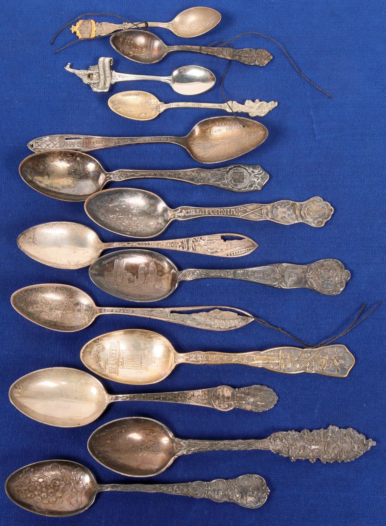 This is a cache of souvenir spoons all from the state of California. Fourteen spoons in all: Cliff House SF gold wash on bowl; Sequoia tree spoon heavily tarnished; Eureka; Eureka City Hall; San Francisco fire 1906; Eureka grapes; Cliff House SF; Glenwood Inn Riverside; Golden Gate bridge SF; Eureka; Los Angeles 1915; Santa Barbara Zoo; Cliff House SF with emanel.