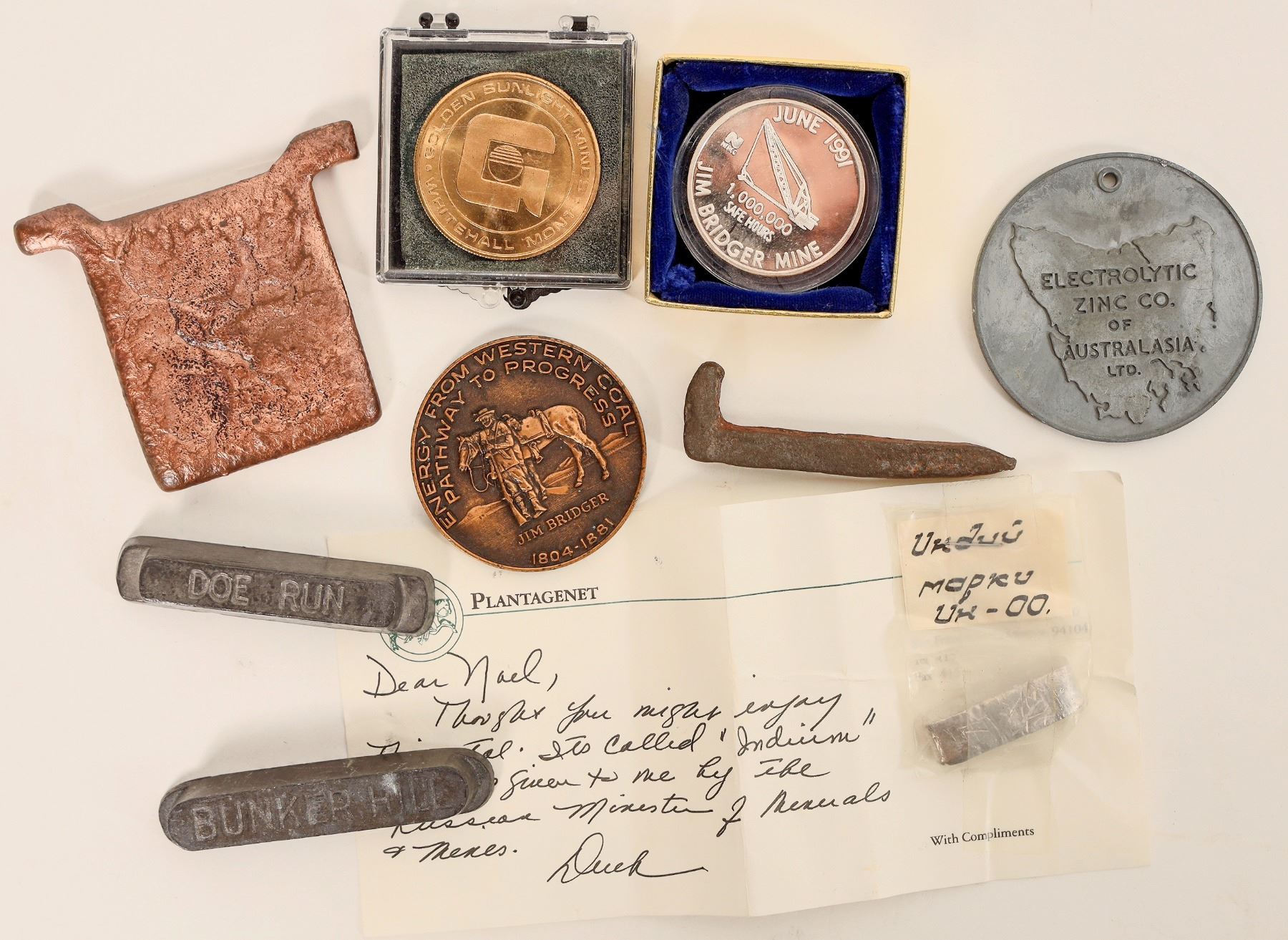 Ingots: Bunker Hill (lead); Doe Run (lead, Missouri); copper (Chino); zinc (in form of a medal, Risdon, Tasmania) indium (Russia). Medals: silver round, Jim Bridger Mine, 1991; a brass Jim Bridger medallion; Golden Sunlight Mines (Montana); crude metal spike with illegible letter punched. [