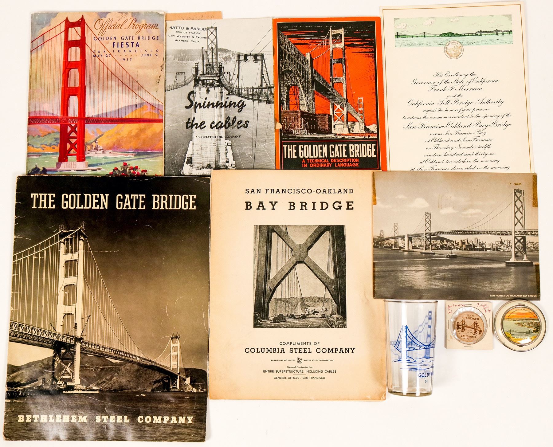 Lot of 10 souvenirs from the openings of the Golden Gate and Oakland Bay bridges, c1935-37. Includes five publications, "Spinning the Cables" by Associated Oil Company 1935, "The Golden Gate Bridge, a Technical Description" 1935 by E. Cromwell Mensch, "Official Program Golden Gate Bridge Fiesta" San Francisco May 27-June 2 1937, "The Golden Gate Bridge" by Bethlehem Steel Company 1937, and "San Francisco-Oakland Bay Bridge" by Columbia Steel Company 1935. Includes jumbo RPC postcard of the Bay Bridge, an invitation from California Governor Frank F. Merriam and California Toll Bridge Authority to L.J. Defosset, acting member Chamber of Commerce Highway Committee, to attend SF-Oakland Bay Bridge opening ceremonies, a souvenir makeup compact, wooden token, and drinking glass, clear with blue image of the bridge, dated 1937.