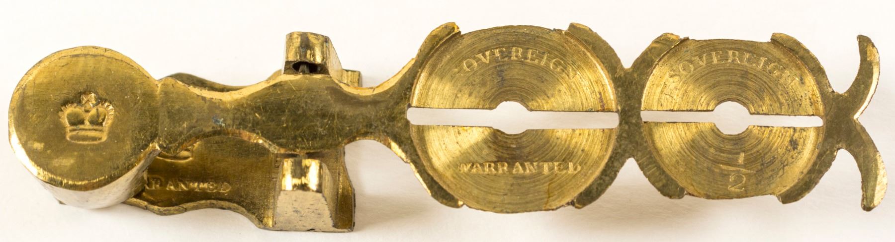 British gold "Sovereign/ Warranted". Crown emblazoned in two places. Sovereign Warranted and Sovereign 1/2 gold coins. 3.75", good condition.