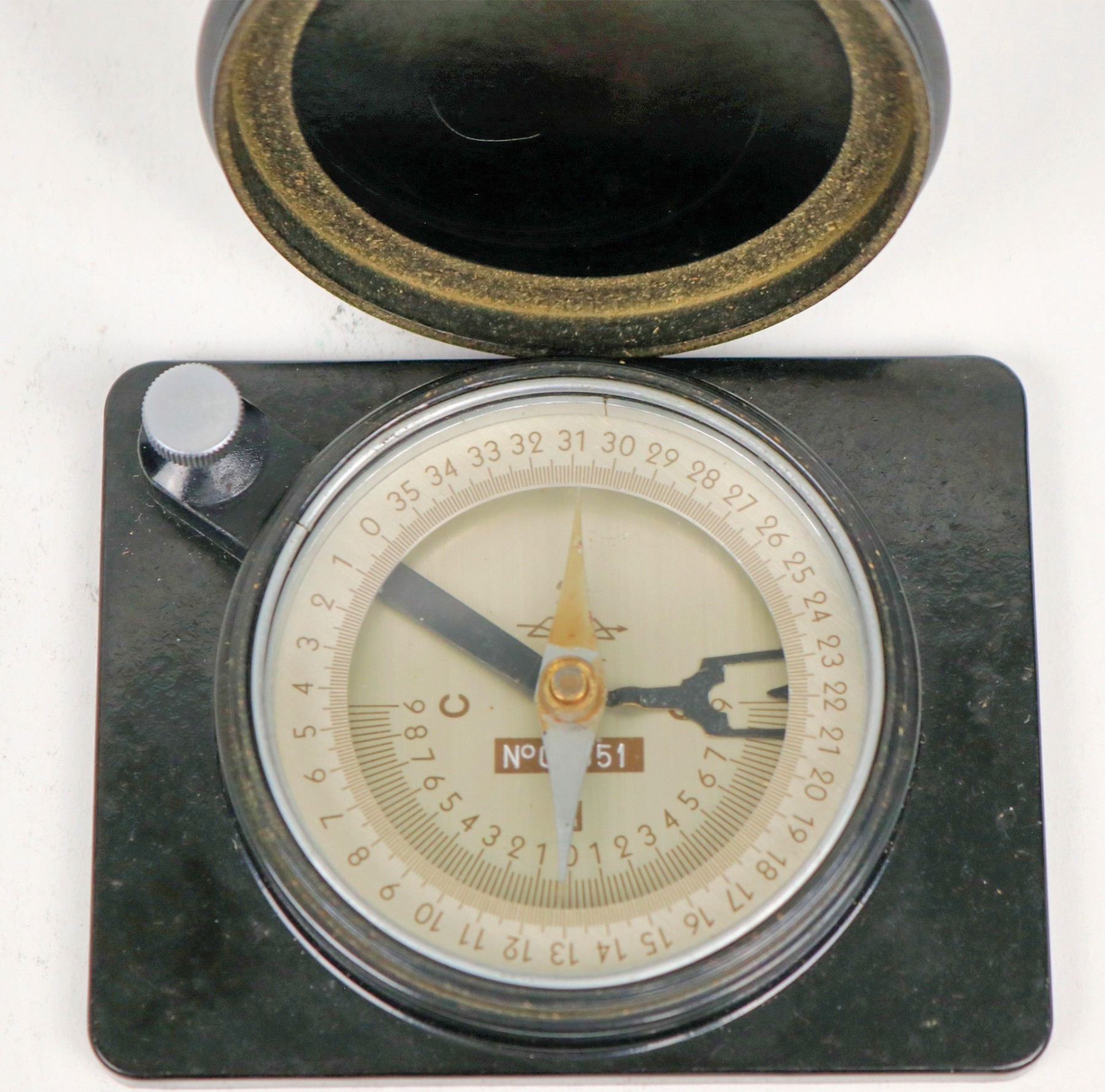 This is a Soviet era Mountain Military compass that reads in degrees as well as military clicks. A rare find. The base is bakelite. S/N 00051 with cover. 3 in. X 3.5 in. In working order. Please see photo for details.