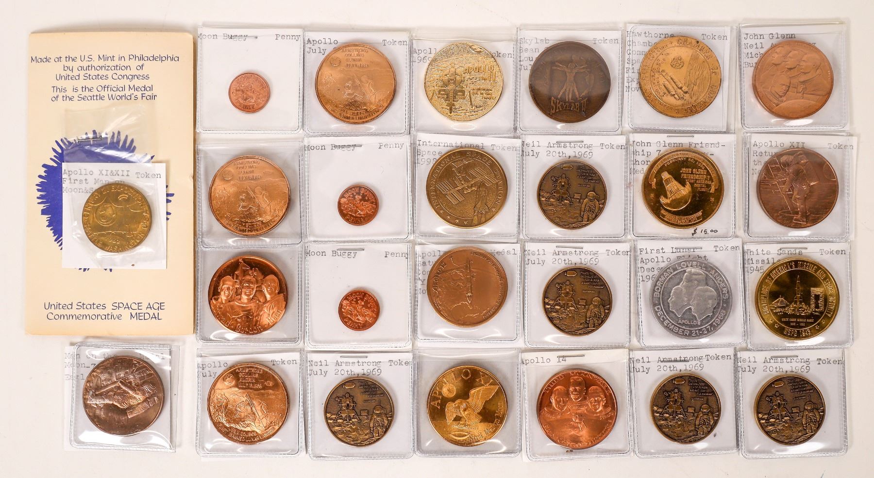 Lot of over 25 medal commemorating the exploration of outer space. Apollo flights, Skylab, John Glenn, Neil Armstrong, Moon Buggy pennies, Official Seattle World's Fair Issue of the World's First United States Space Age Coin.
