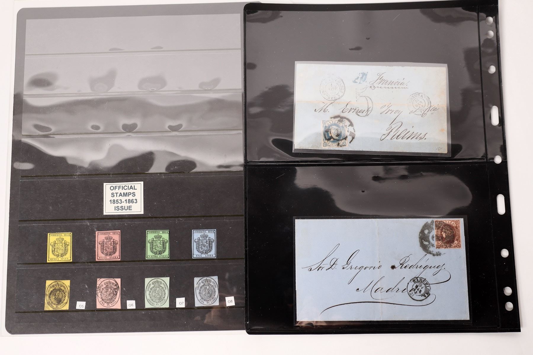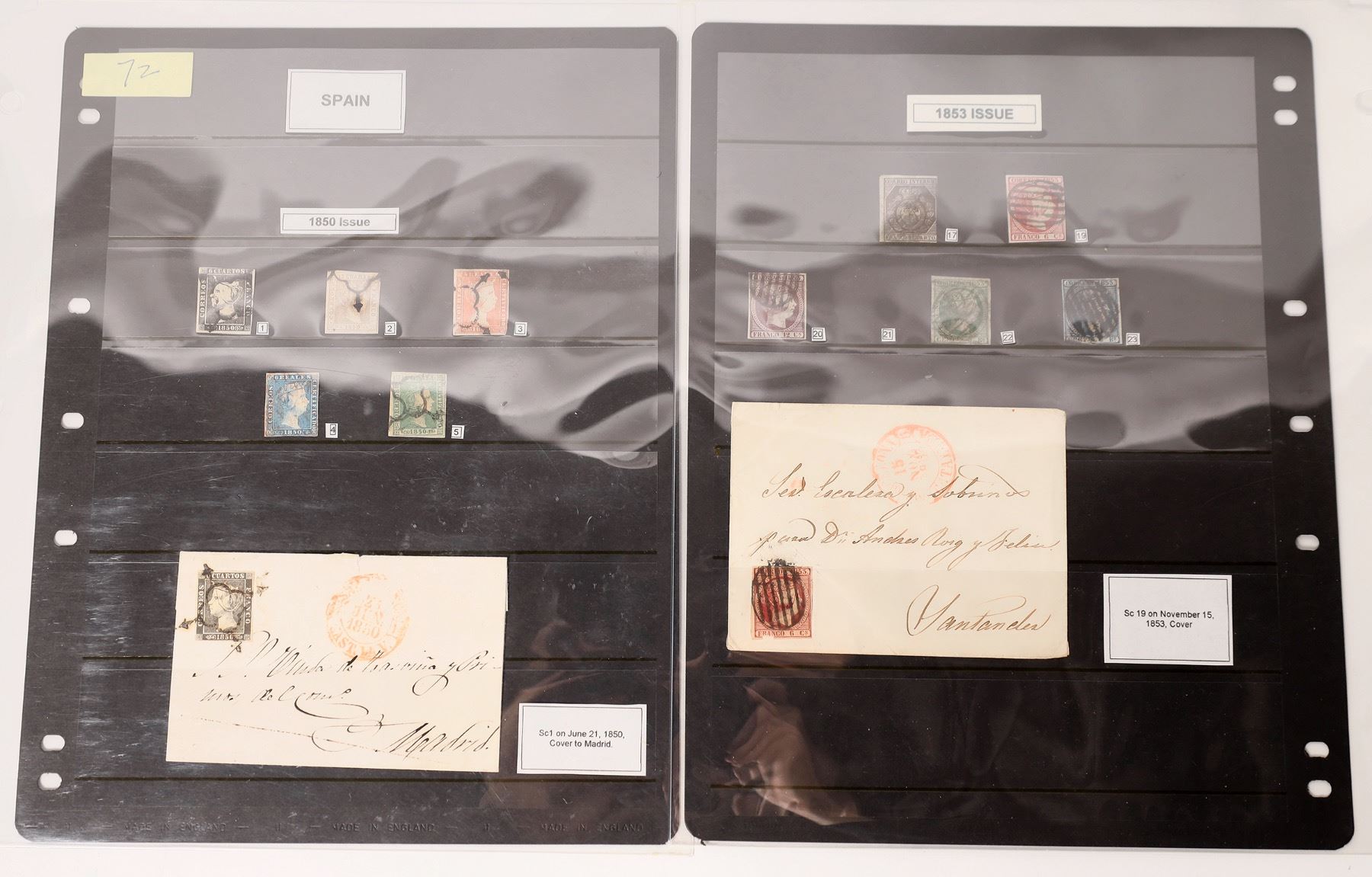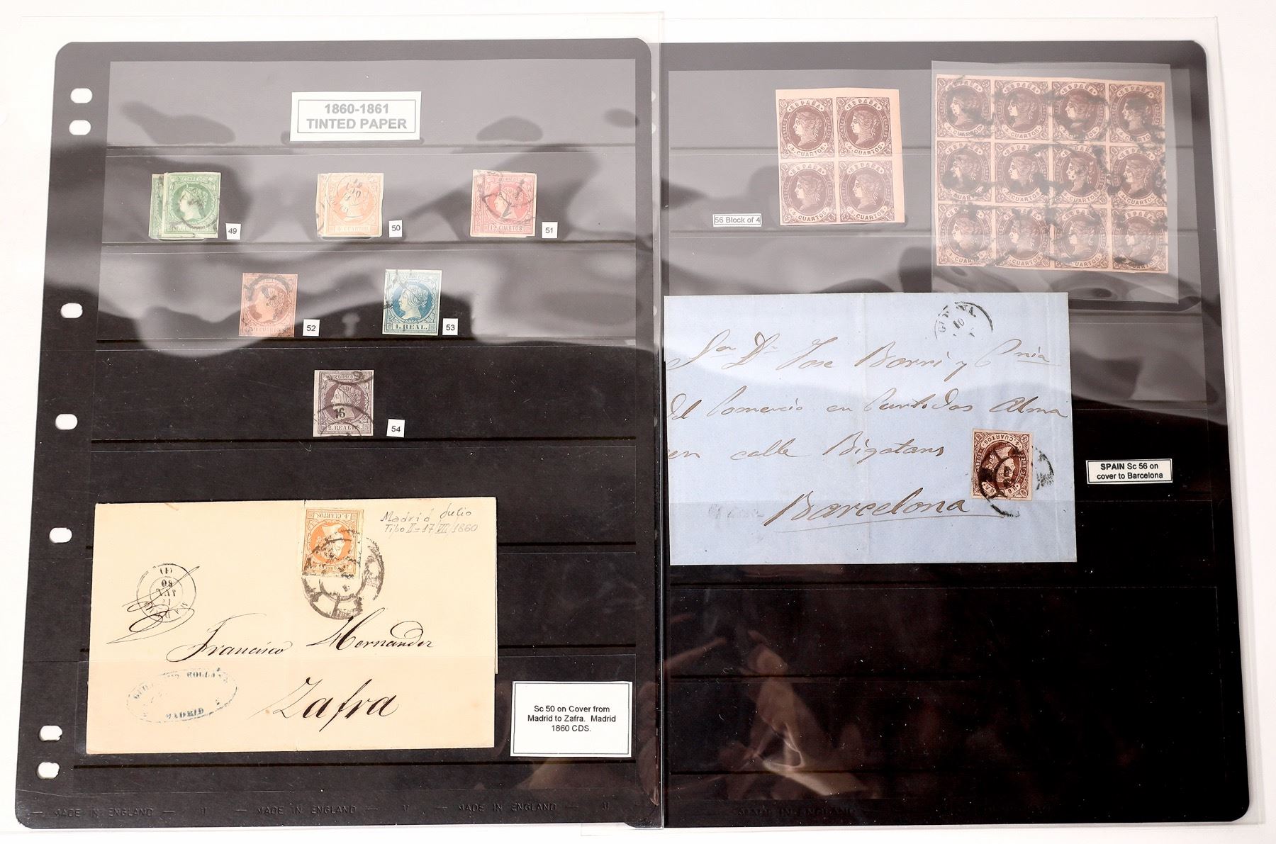 Spain 1850-65 imperforate issues. Scott #1//73, O1-8, impressive coverage comprising 119 stamps and 18 covers. Substantially complete (61 different): 1850 complete incl. 6r blue unused, 1851 incl. 12c & 5r with Sisimondo certificates, 1852 complete, 1853 ex 2r, 1854 incl. 2c, 1r & 6r, 1856 incl. 2c & 1r, 1864 19c, 1865 19c with Sisimondo certificate. Condition mixed as expected, please see scans, good basis for further expansion.