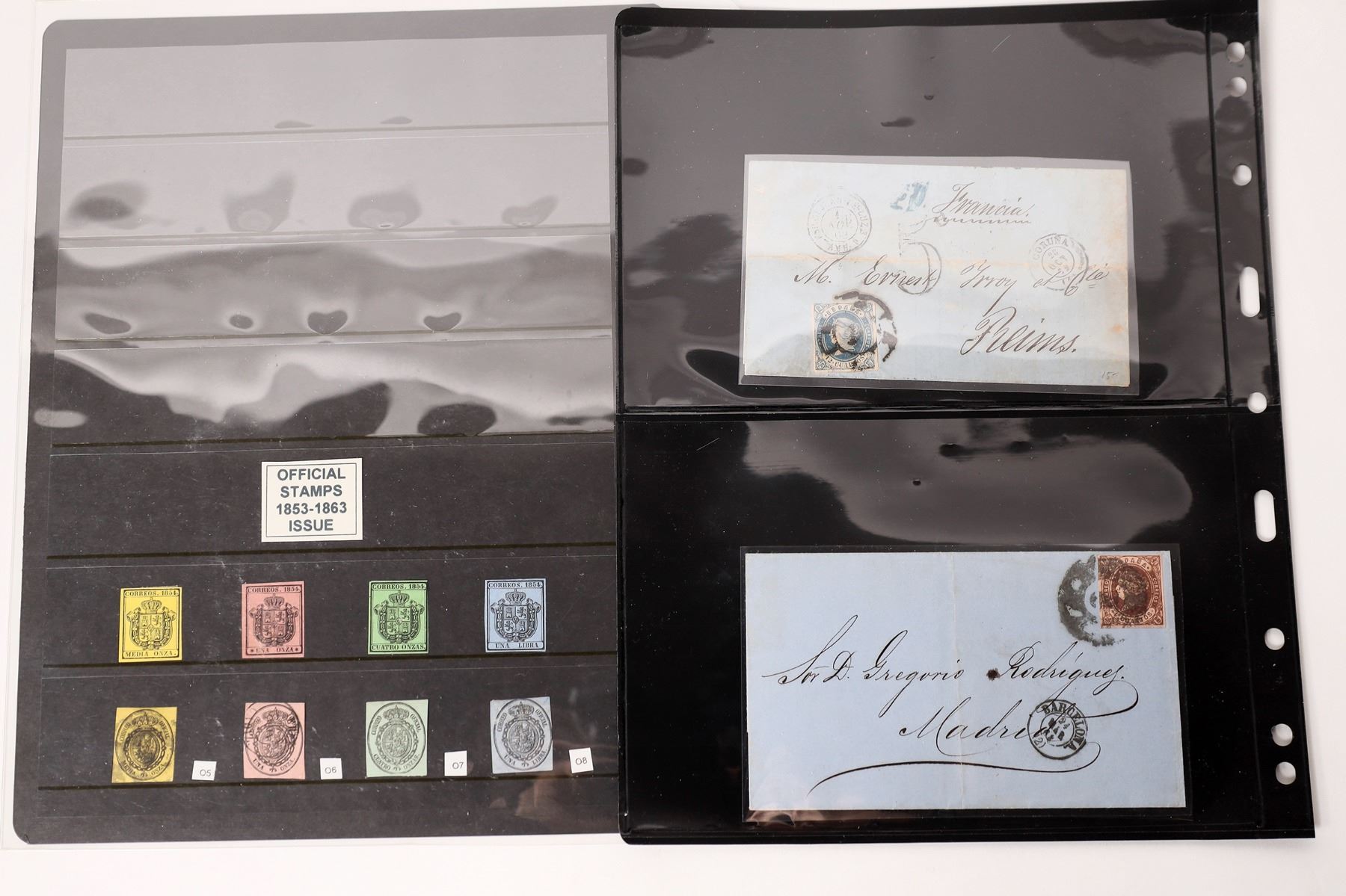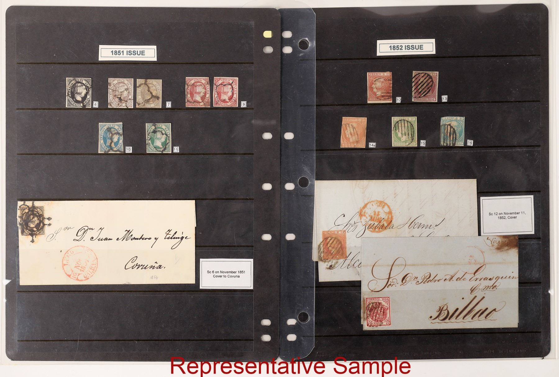 Spain 1850-65 imperforate issues. Scott #1//73, O1-8, impressive coverage comprising 119 stamps and 18 covers. Substantially complete (61 different): 1850 complete incl. 6r blue unused, 1851 incl. 12c & 5r with Sisimondo certificates, 1852 complete, 1853 ex 2r, 1854 incl. 2c, 1r & 6r, 1856 incl. 2c & 1r, 1864 19c, 1865 19c with Sisimondo certificate. Condition mixed as expected, please see scans, good basis for further expansion. Spain 1850-65 Gary Bracken Collection