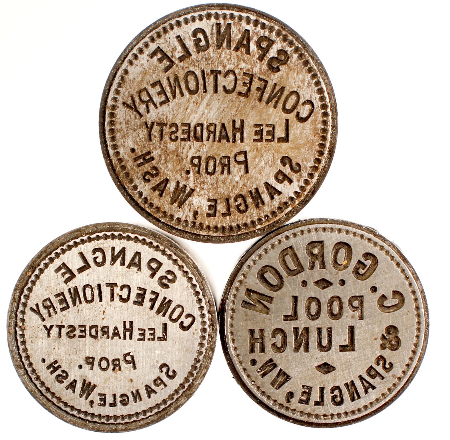 3 token dies self identified from Spangle, WA. 21mm: Spangle Confectionery, C Gordon Pool. 24mm: Spangle Confectionery. Northwest Territorial Mint Historical Die Collection.