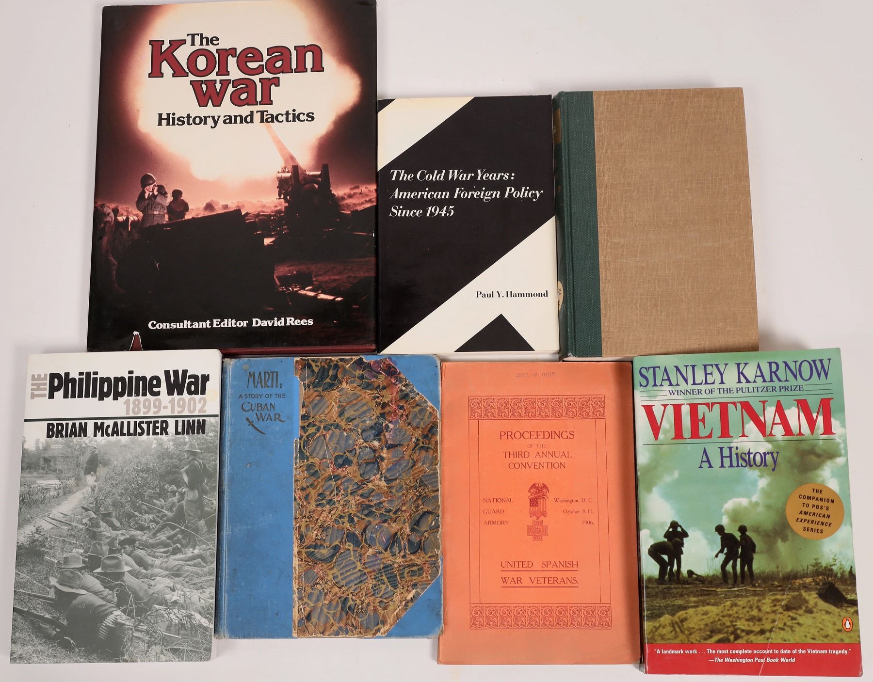 This collection of books covers the lesser wars for the USA: "The Philippine War 1899-1902: by Brian McAllister Linn, 2000, paperback 328pp. with index, very good condition. "Marti: A Story of the Cuban War" by Ann Maria Barnes, 1899, 96 pp. hardcover, broken binding, loose pages, foxed corners. 7 in. X 8.5 in. "United Spanish War Veterans Third Annual Convention" 1906 paperback 6 in. X 9 in. "The Cold War Years: American Foreign Policy Since 1945" by Paul Hammond, paperback 1969, 259 pp., 5 1/2 in. X 8 1/2 in. library book, very good condition. "The New Breed, the Story of he U.S. Marines in Korea" by Andrew Greer, hardcover, 1952, 375 pp., tan/green fabric cover, library book, fold-out maps, many photos, 6 in. X 8 1/2 in. very good condition. "The Korean War History and Tactics" by consultant editor David Rees, hardcover with DJ, tear bottom edge of DJ, red fabric cover, well illustrated with photos, 126 pp. 9 in. X 12 in. "Vietnam A History" by Stanley Karnow, paperback, 720 pp., 1997, 6 in. X 9 in. good condition. Please see photo for details.