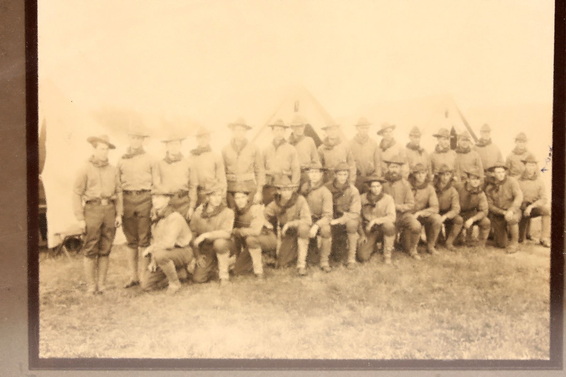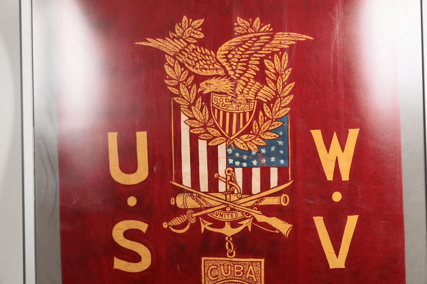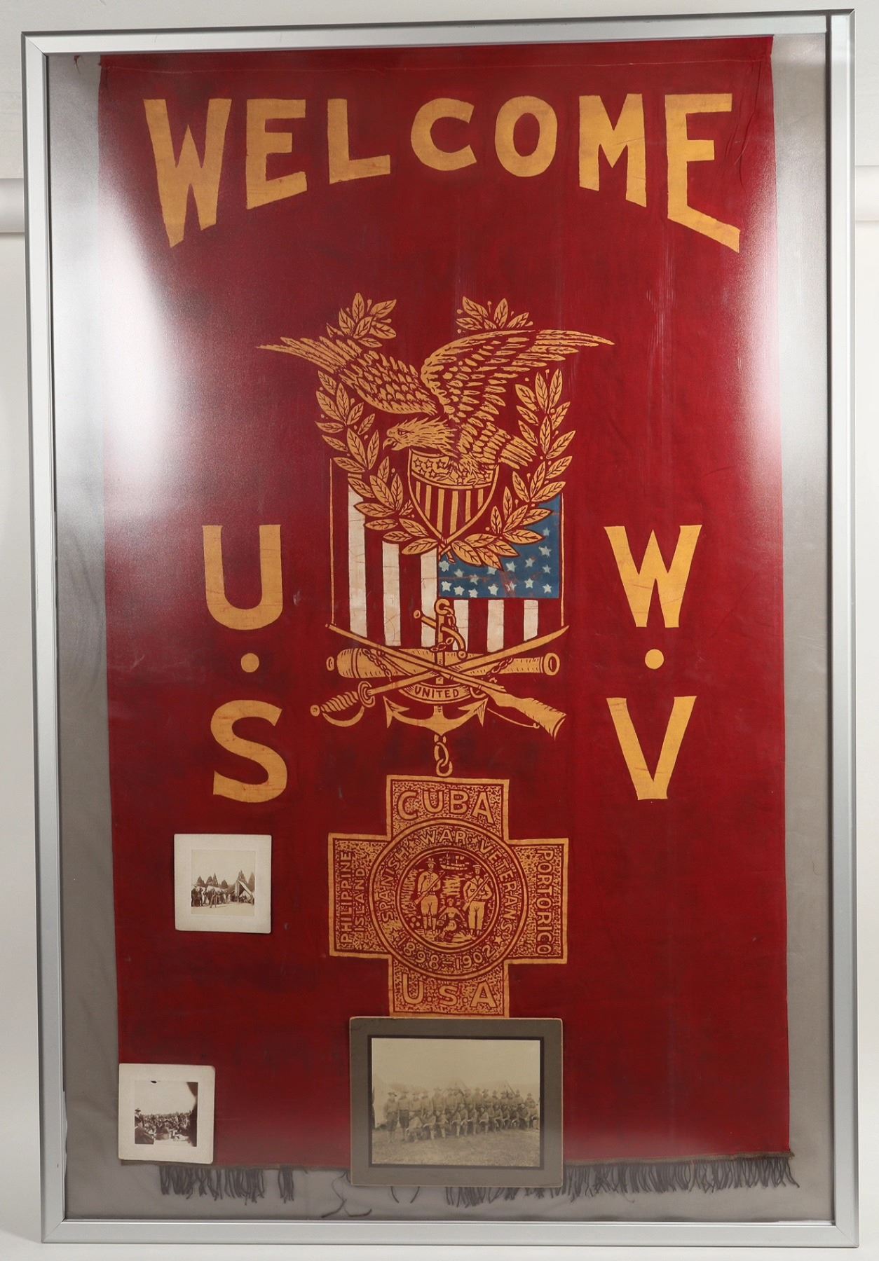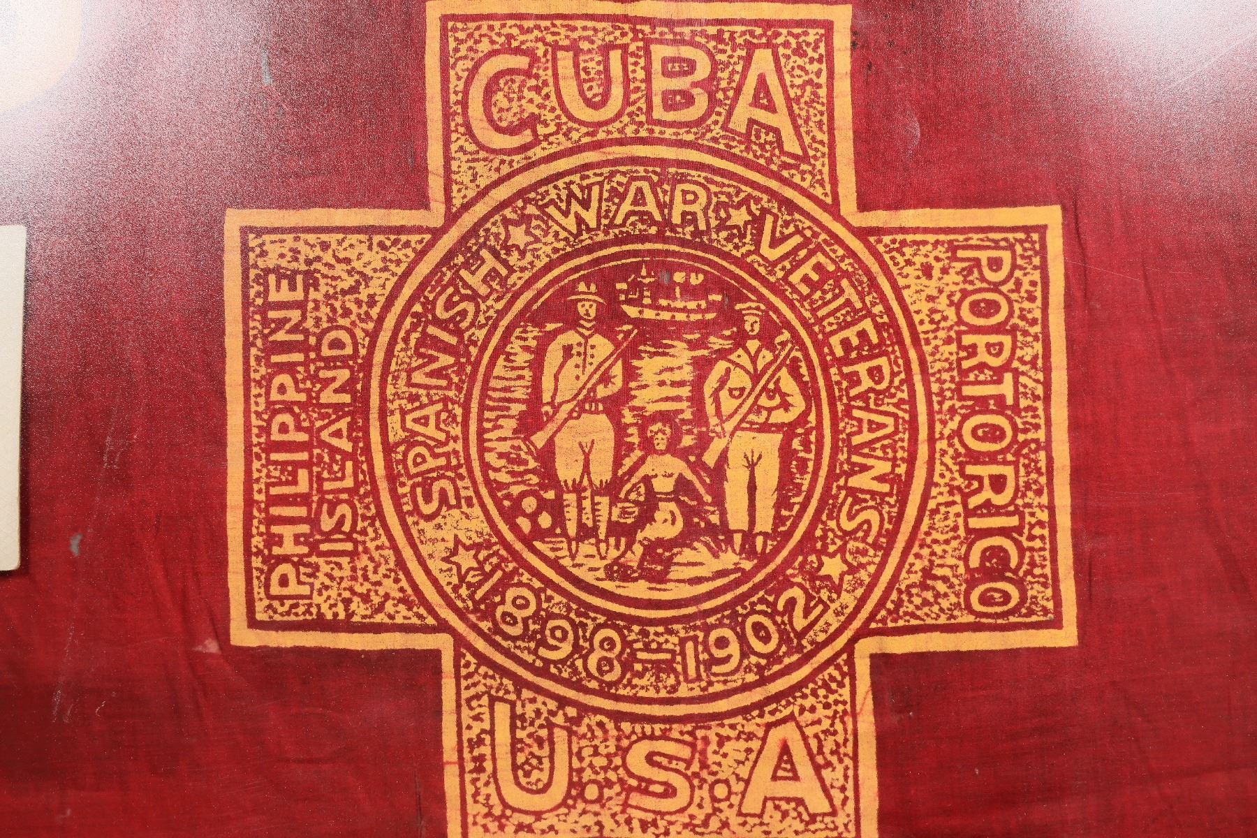 Large mounted parade banner. 41.5 x 61 in Frame can easily dismantled. Red background, gold lettering, center symbol eagle on top of American flag above cannon and cross swords. All above the cross medal of the Spanish American War Veteran 1898-1902. There are three photos of different troops. Entire banner and photos are covered by clear vinyl.