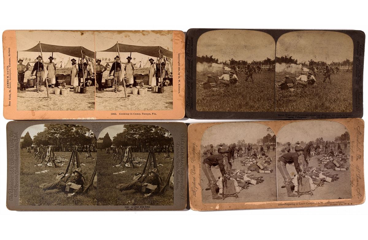 Lot of 4: 1) View of the New York 2d Volunteer Infantry preparing to leave camp. Published by the Keystone View Co., 1898. Blank on reverse. On cream colored board, 7" x 3.25". 2) View of an infantryman reading "A letter from home." Published by C.H. Graves, 1898. With embossing on gray board. Blank on reverse. 7" x 3.25". 3) A view of "Heroic Washington Volunteers advancing-Filipinos 800 yards in front-Tausig Philippines." Published by Underwood & Underwood, 1890. Crease at top. On gray board with description on reverse. 7" x 3.25". 4) A view of men "Cooking in Camp, Tampa, Fla. Photographed and published by B.W. Kilburn, Littleton, NH, 1898. Slight staining at top. On peach board with publishing info on reverse.