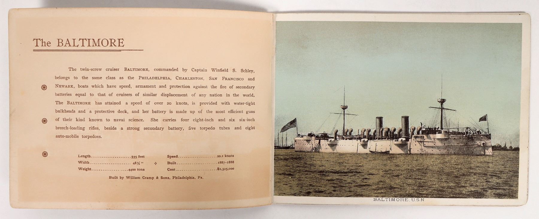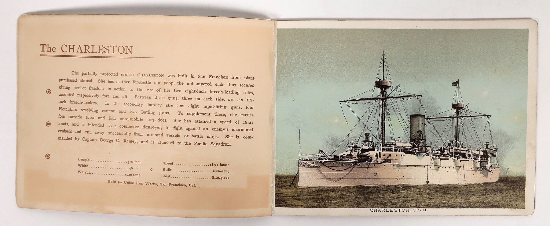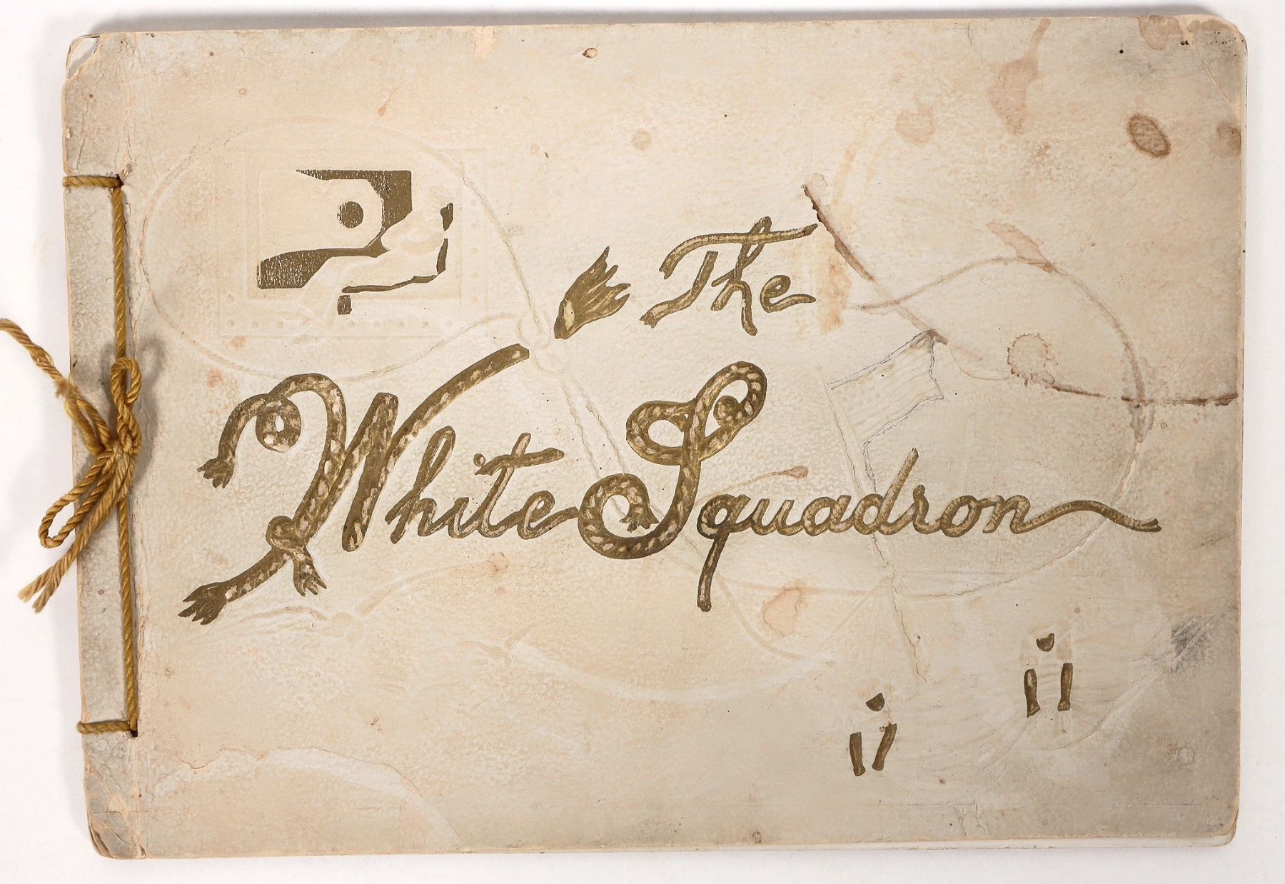 The White Squadron booklet featuring about 15 chromolitho images of US warships. 6x8.5". Embossed front cover with small stains.