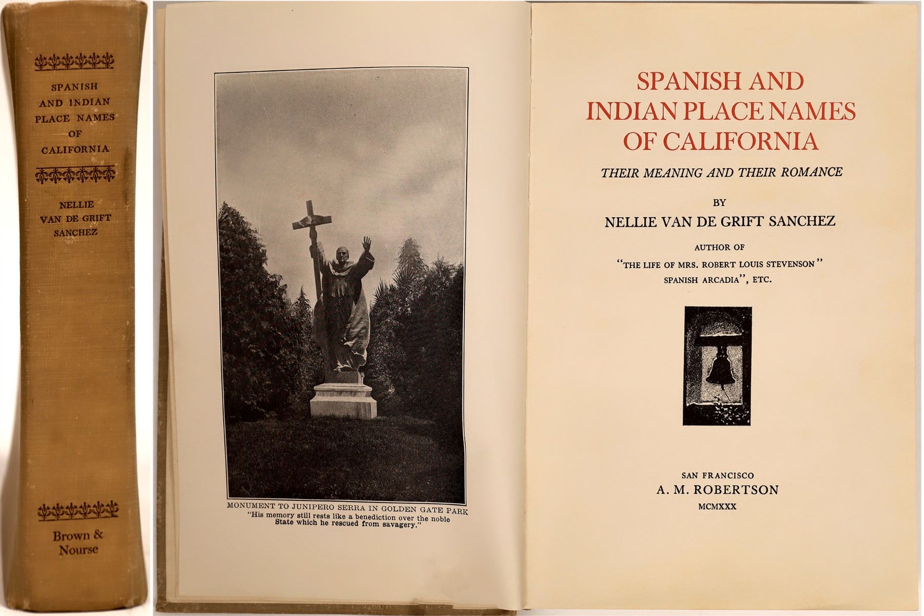 Spanish & Indian Place Names of California by Nellie Van De Grift Sanchez. San Francisco; A. M. Robertson; 1930. Good condition. Dust jack missing. Great California historical reference piece.