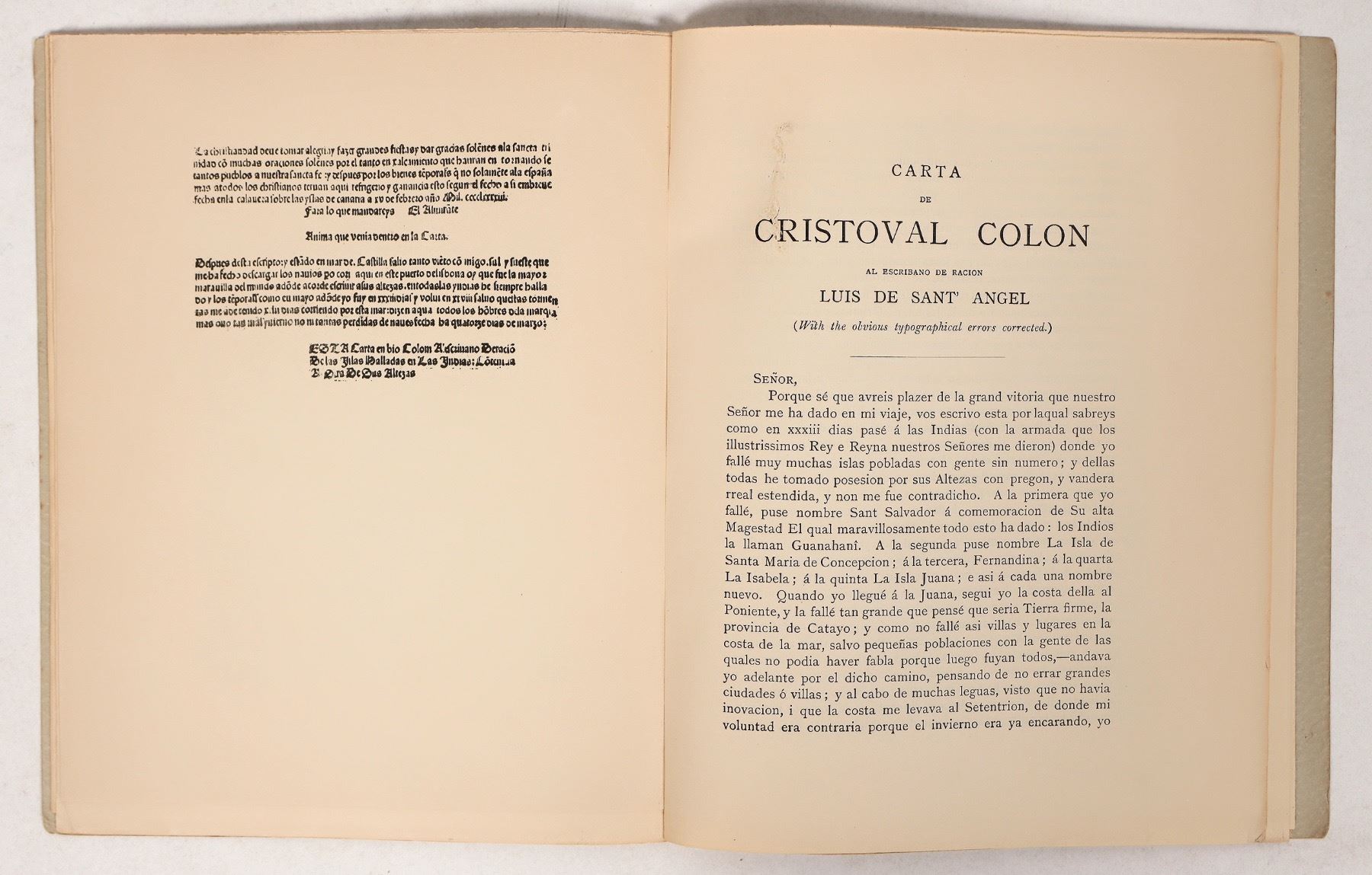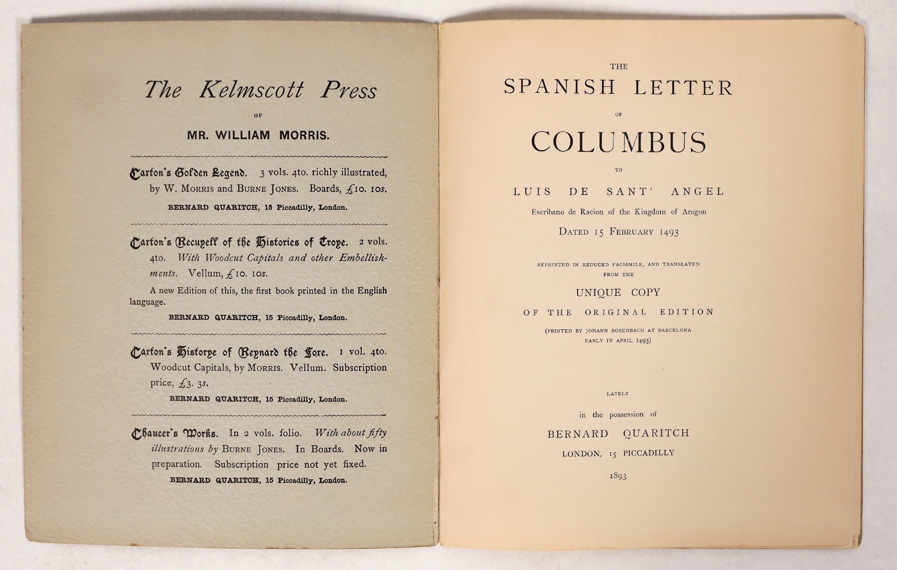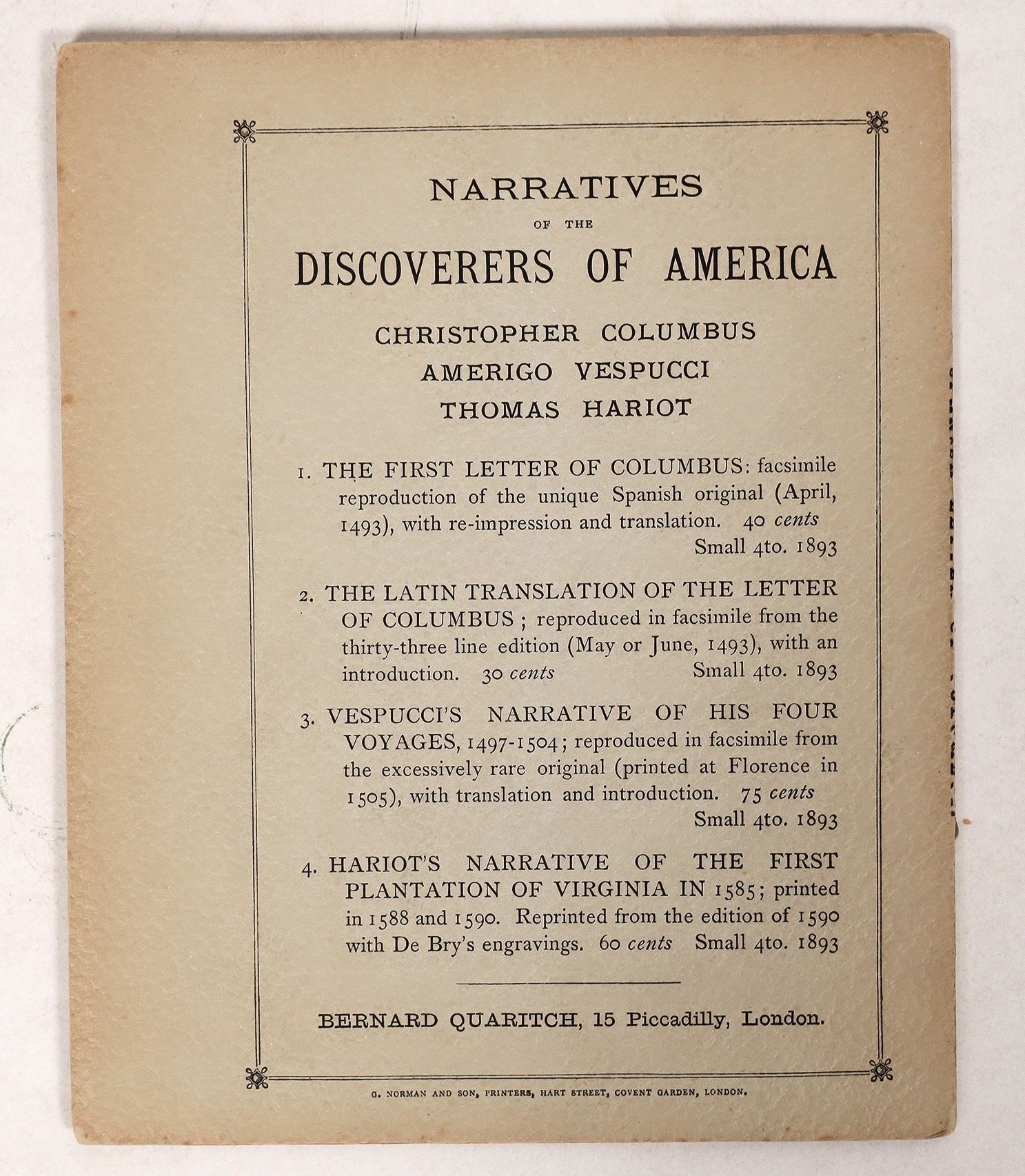 This paperback pamphlet is titled" "The Spanish Letter of Columbus written by Him of Feb. 15, 1493 of America/ Reproduced in the facsimile from the unique copy of the original edition/ Barcelona, April, 1493/ with a translation and introduction. London Bernard Quaritch/15 Piccadilly/ 1893". Roughly 36 pages for introduction, copy of original document in Spanish, and translation. Yellowed pages. 7 in. X 9 in. "London: G. Norman and Son, printers Hart Street, Covent Garden". Please see photo for details.