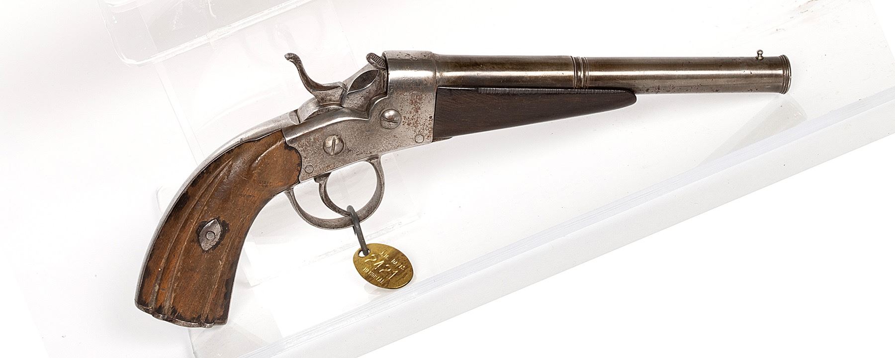 This pistol is Spanish made .45, Copy of Remington rolling block 6 in barrel, wood fore/pistol grip, bead front sight, octagon to round barrel. SN: N/A, JMD Oval Tag: 2421, Condition: Good, >