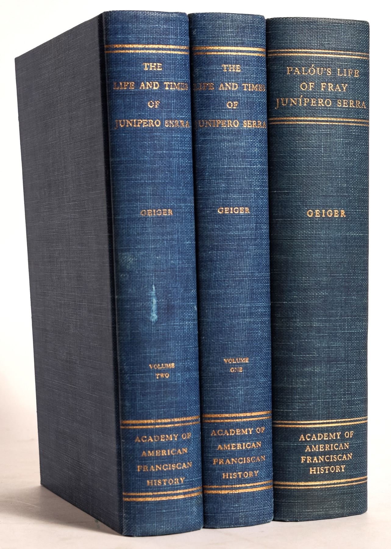 (3) Books on the life of Junipero Serra, all of them signed by the author. Serra was a Spanish Priest and Missionary born 1713-1784. He became known as the Apostle of California for his missionary work with the Native Americans of North America. "The Life and Times of Fray Junipero Serra O.F.M or the Man Who Never Turned Back" A Biography by Maynard J. Geiger Volume I 1959 & II 1959, both signed by the author made out to Mr. Andrew J Harley. Volume I is 448 pages, Volume II 508 pages. The third book is "Palou's Life of Fray Junipero Serra" Translated & Annotated by Maynard J. Geiger. 1955. 547 pages. All three books complete with photos and illustrations throughout. All in good condition.