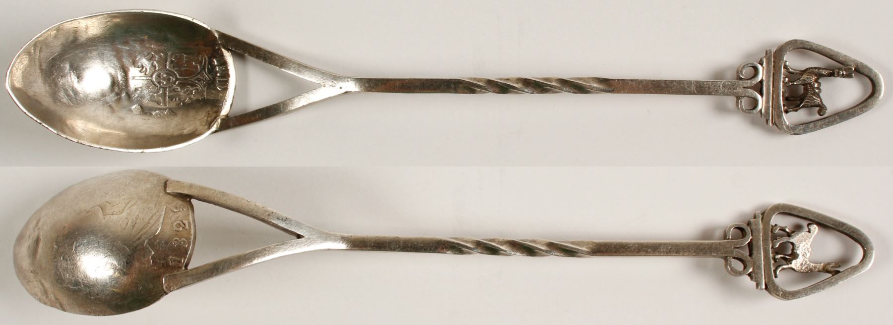 Beautiful silver spoon made in Spain. Has IND. initials on bowl with a Crest on the bowl. Has some wear. 1.25" x 7.25". Salvatore Falcone Collection.