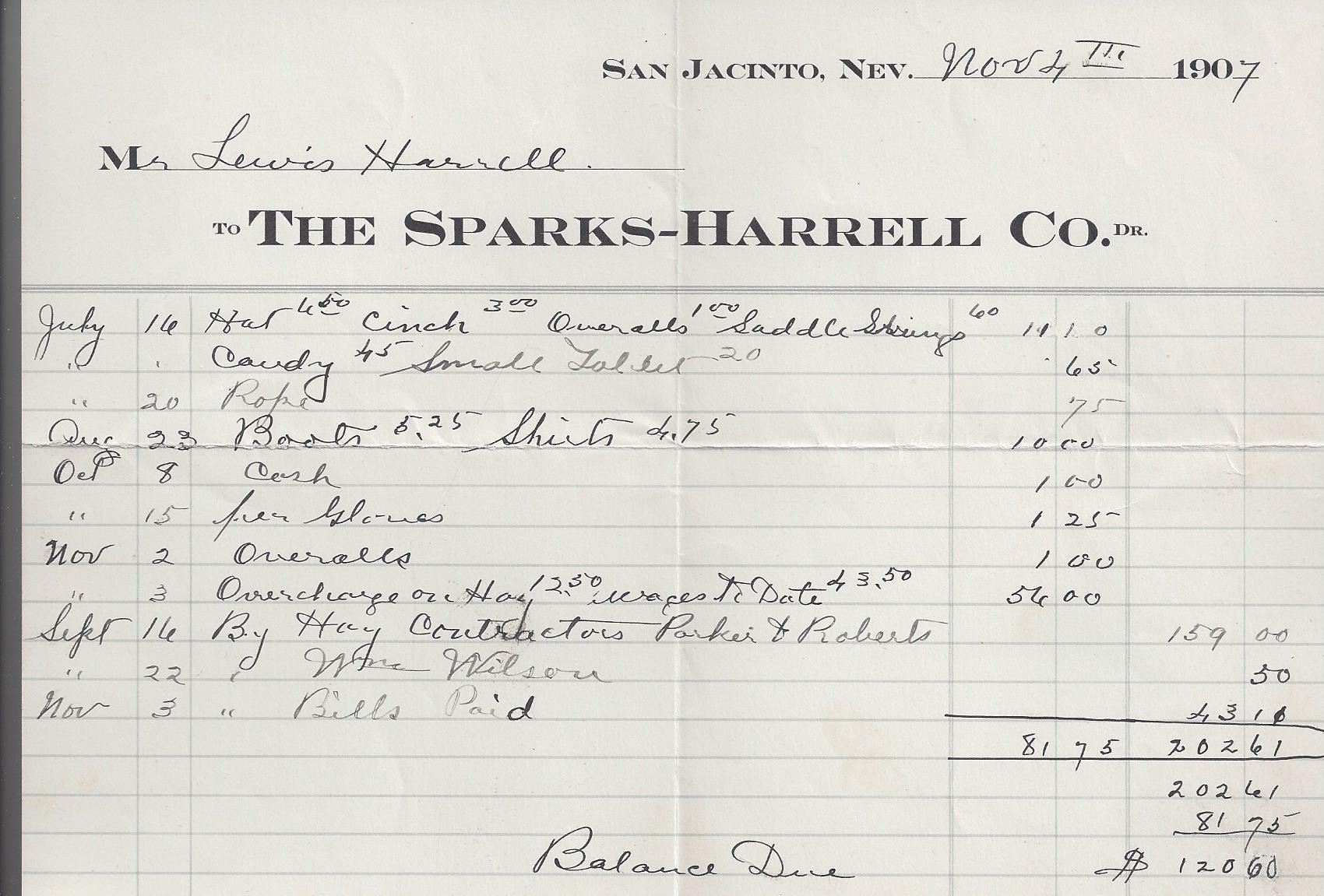Lot of three. 1) A rare San Jacinto datelined billhead for the Sparks Harrell company, Dated 1907. 2) A nice horse pictorial billhead from James Bain of Elko, Nevada. 1895. For blanket, reins, etc. 3) A Cassia County Telephone Company (Albion, Idaho) letter from 1903. It is for a 'camp'? I assume it is some sort of telephone portable thing? All together there are three interesting pieces of paper here al involving this ranching empire! All are addressed to Louis Harrell. Biography of Governor John Sparks and a few notes on this large conglomerate that spanned several states. State: Nevada City: San Jacinto, Elko Date: HWAC# 99414